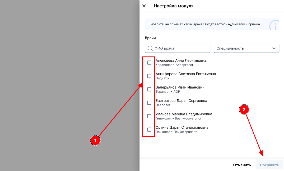 В настройках выберите врачей, у которых будет возможность вести аудиозапись приёма и нажмите «Сохранить».