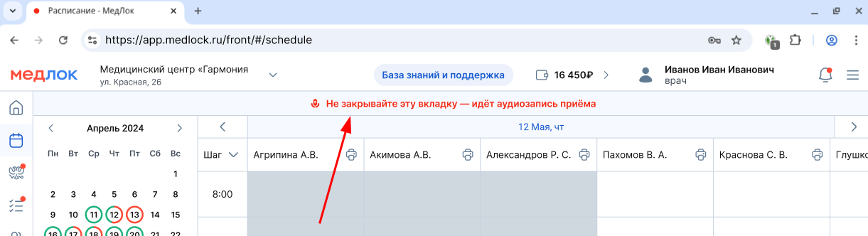 Запись ведется в одной вкладке, такую вкладку до завершения записи нельзя закрывать. При этом, можно использовать МедЛок как обычно: создать протокол, зафиксировать данные пациента и т.д.