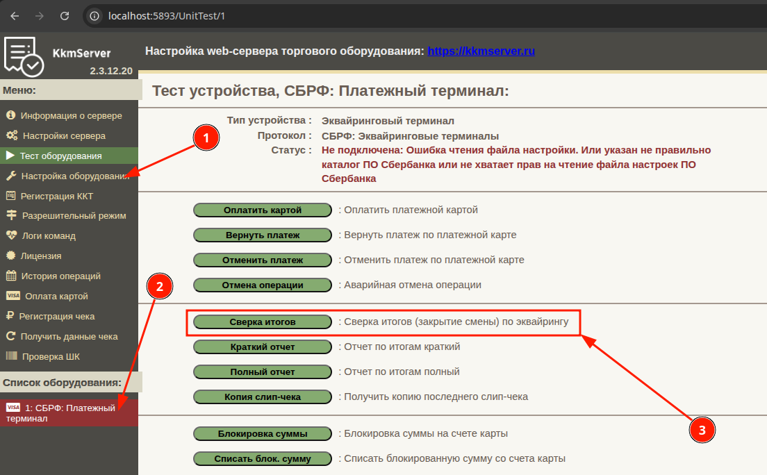 Select«Настройка оборудования», select your terminal and click «Сверка итогов».