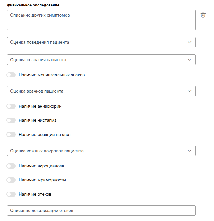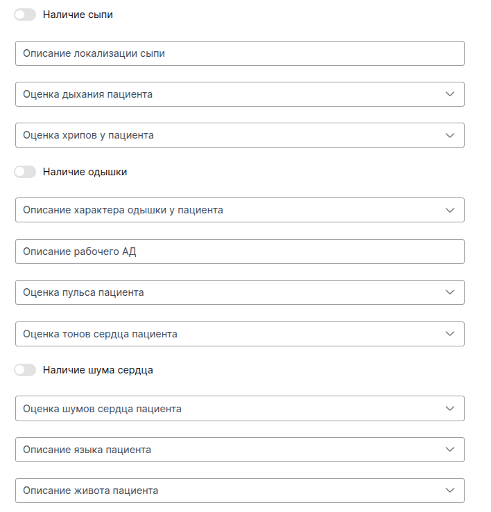 • Переключатели: Наличие акроцианоза, Наличие мраморности, Наличие отеков