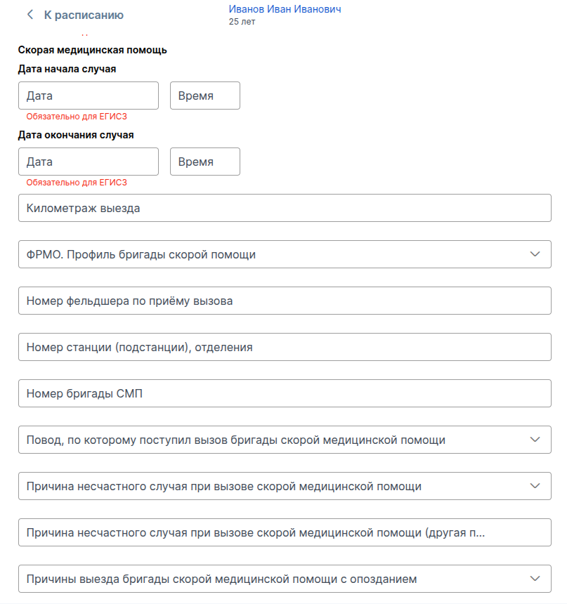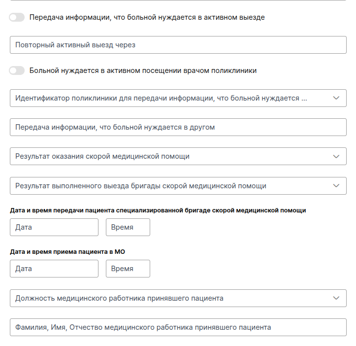 • Результат оказания скорой медицинской помощи: итоговый результат оказанной медицинской помощи, выбор из списка.