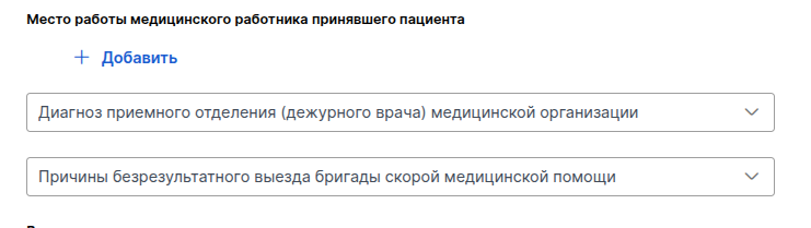 • Должность, ФИО и место работы медицинского работника, принявшего пациента (место работы заполняется через «+ Добавить»).
