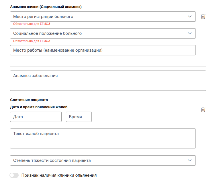 • Состояние пациента - фиксация актуального состояния пациента на момент осмотра, включает поля: