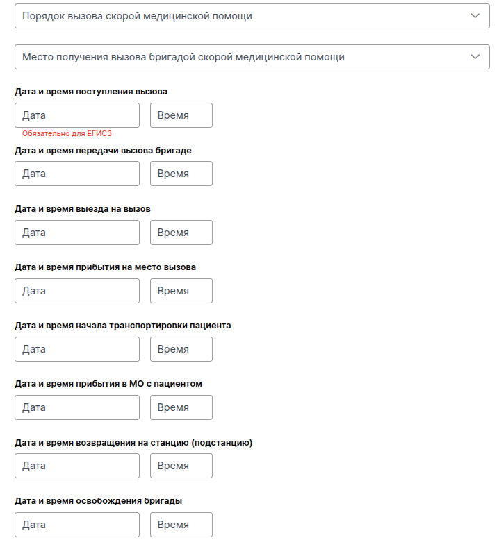 • Дата и время передачи пациента специализированной бригаде скорой медицинской помощи: заполняется, если пациента передали другой бригаде СМП для дальнейшей транспортировки или оказания помощи.