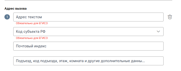 • «Адрес вызова»: опциональное поле, введите адрес с помощью кнопки «+ Добавить» при необходимости.