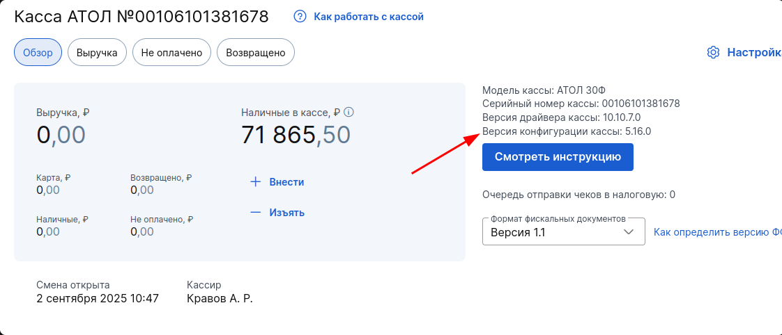 - Если версия ниже 5.16.0 — сначала обновите прошивку до версии 5.16, обратившись в службу поддержки Атол.