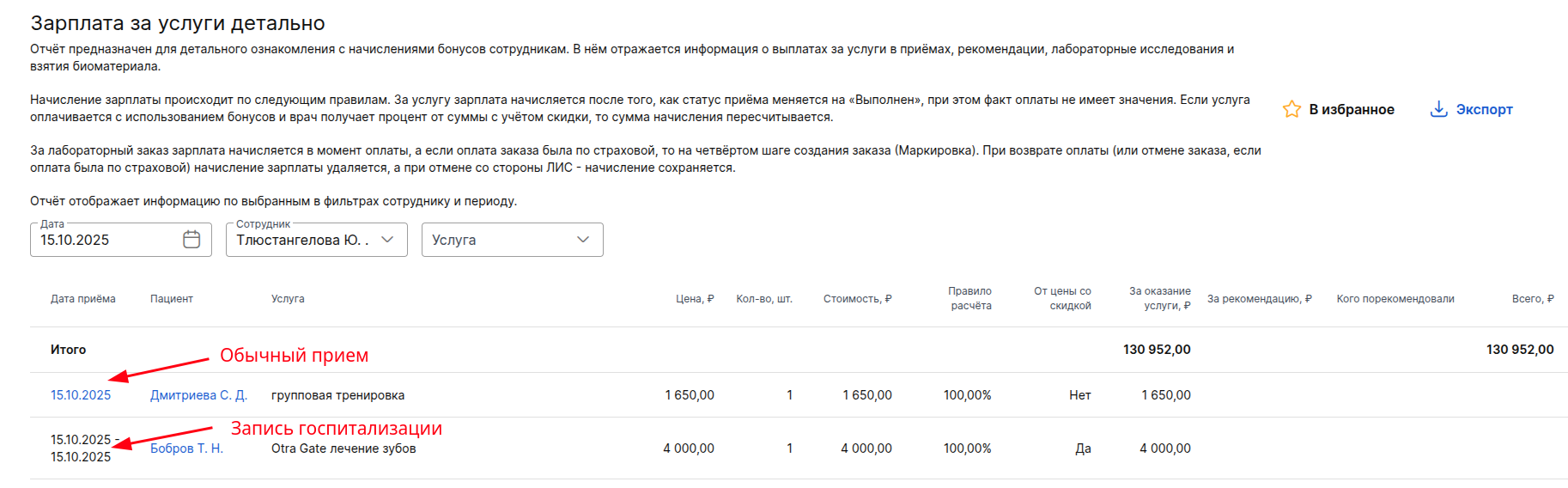 Отчёт можно использовать для оценки затрат на выплаты сотрудникам в отчётный период. В нём содержится информация по выплатам сотрудникам за оказанные или рекомендованные услуги и анализы, а также за почасовую работу.