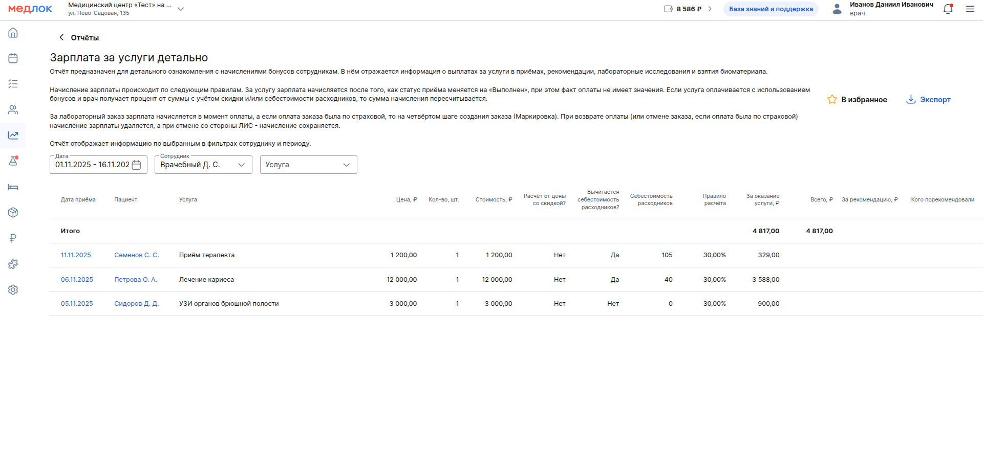 Отчёт сгруппирован по сотрудникам, услугам, исследованиям, взятию биоматериала и фильтруется по периоду. В отчёт также включаются услуги, оказанные в рамках стационара. Они попадают в расчёт после завершения записи о госпитализации (установки статуса «Пациент выписан»).