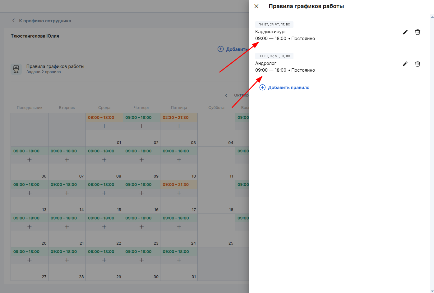 Чтобы посмотреть все добавленные правила, перейдите в раздел «Правила графиков работы».