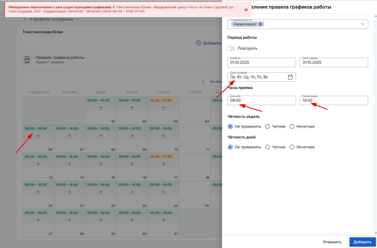 При этом система не позволяет создать два идентичных или пересекающихся графика работы для одного врача и одной специальности. При попытке создать такой график появится ошибка Обнаружено пересечение с уже существующими графиками