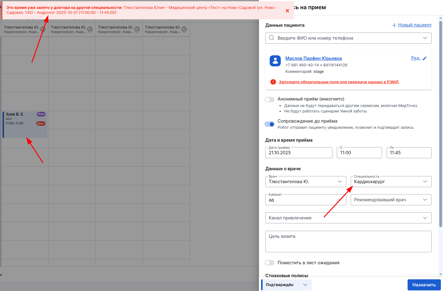 При записи пациента система будет проверять доступность времени для конкретной специальности.