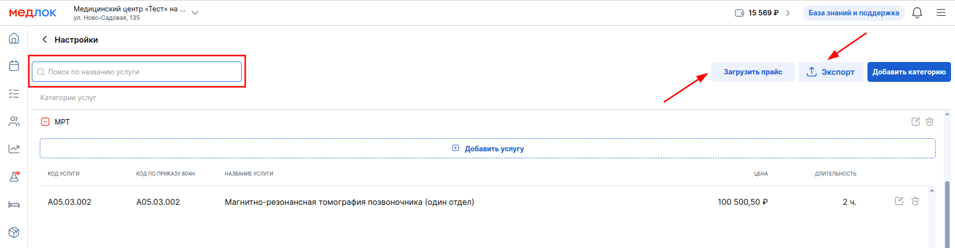 В разделе «Услуги» можно найти услугу по названию и загрузить весь прайс-лист через инструмент «Загрузить прайс».