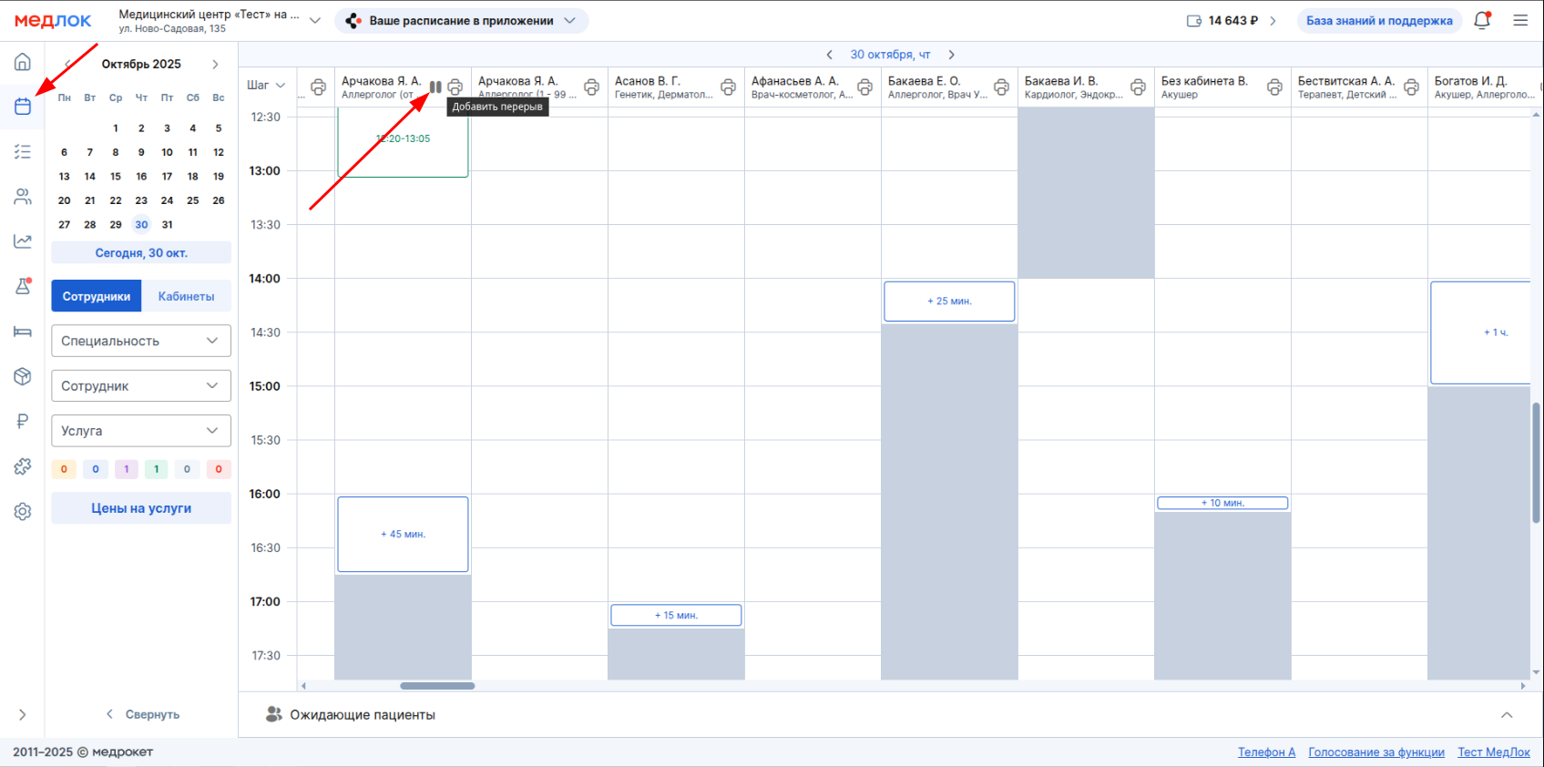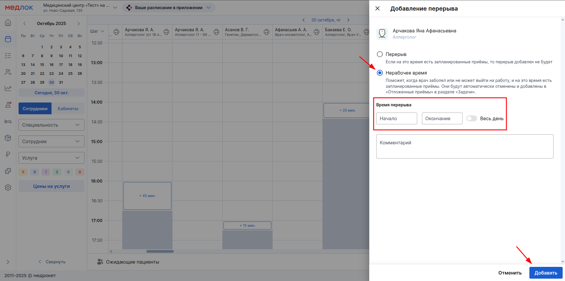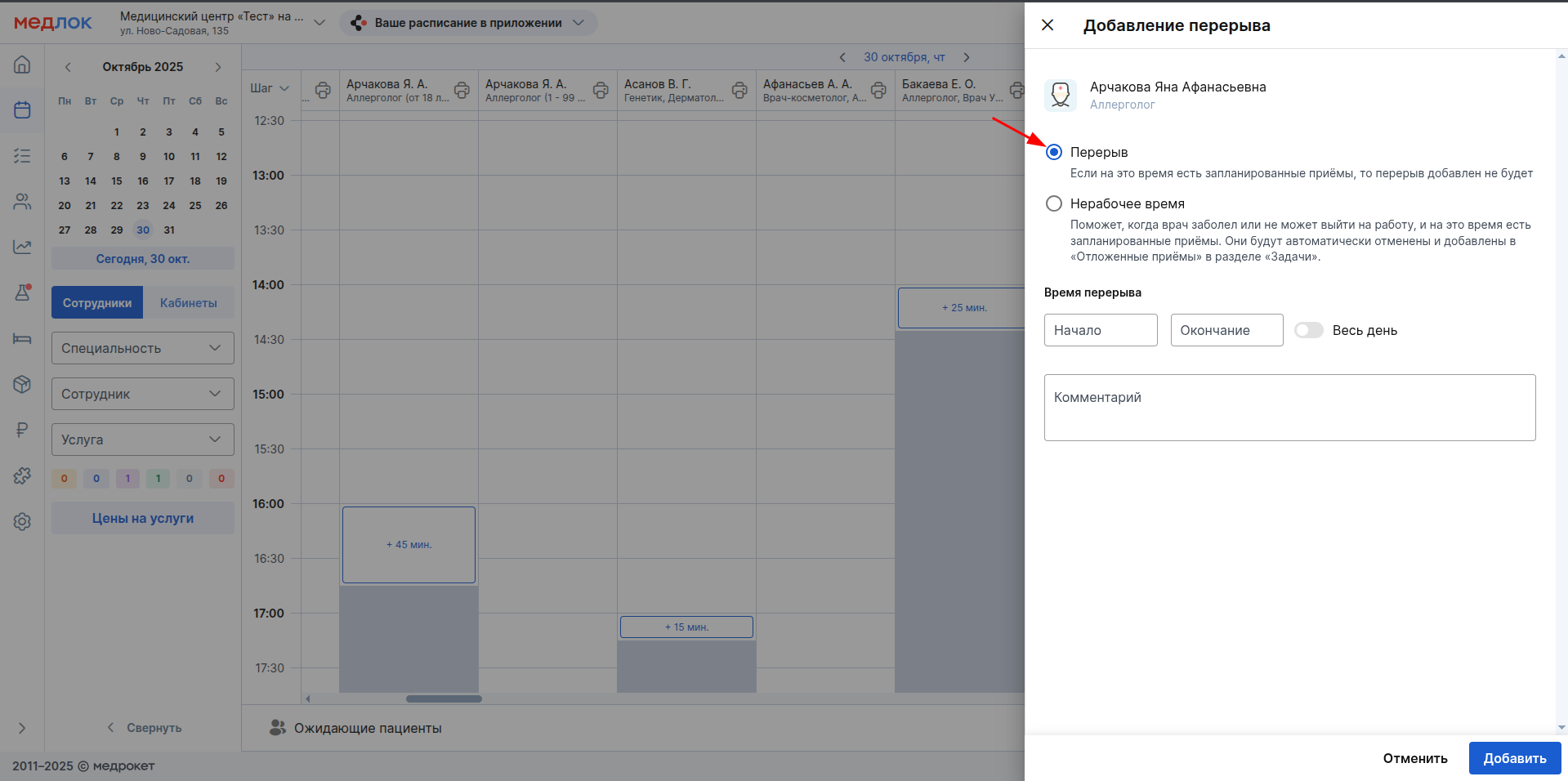 - Как установить перерыв или нерабочее время в случае отсутствия врача