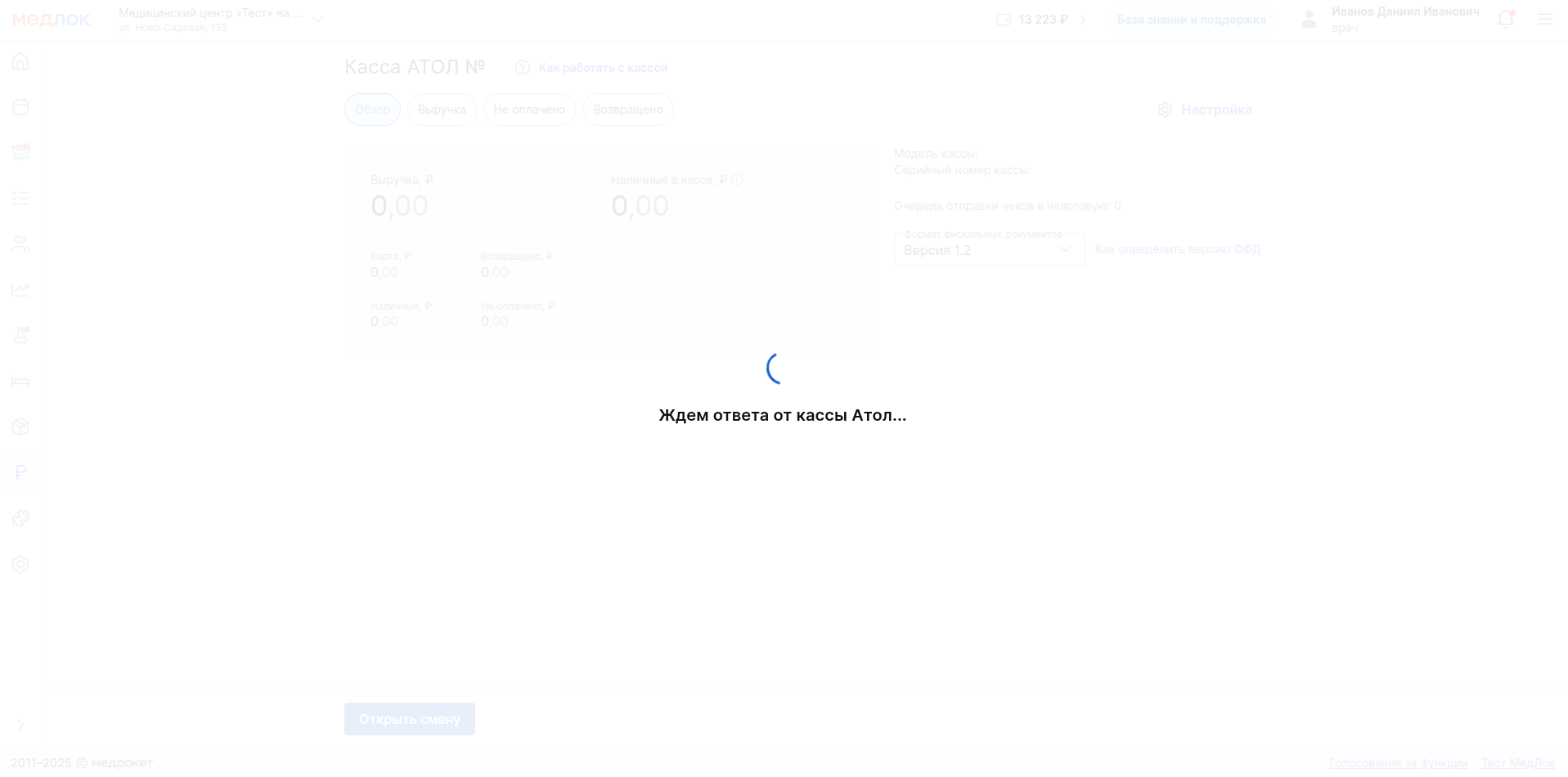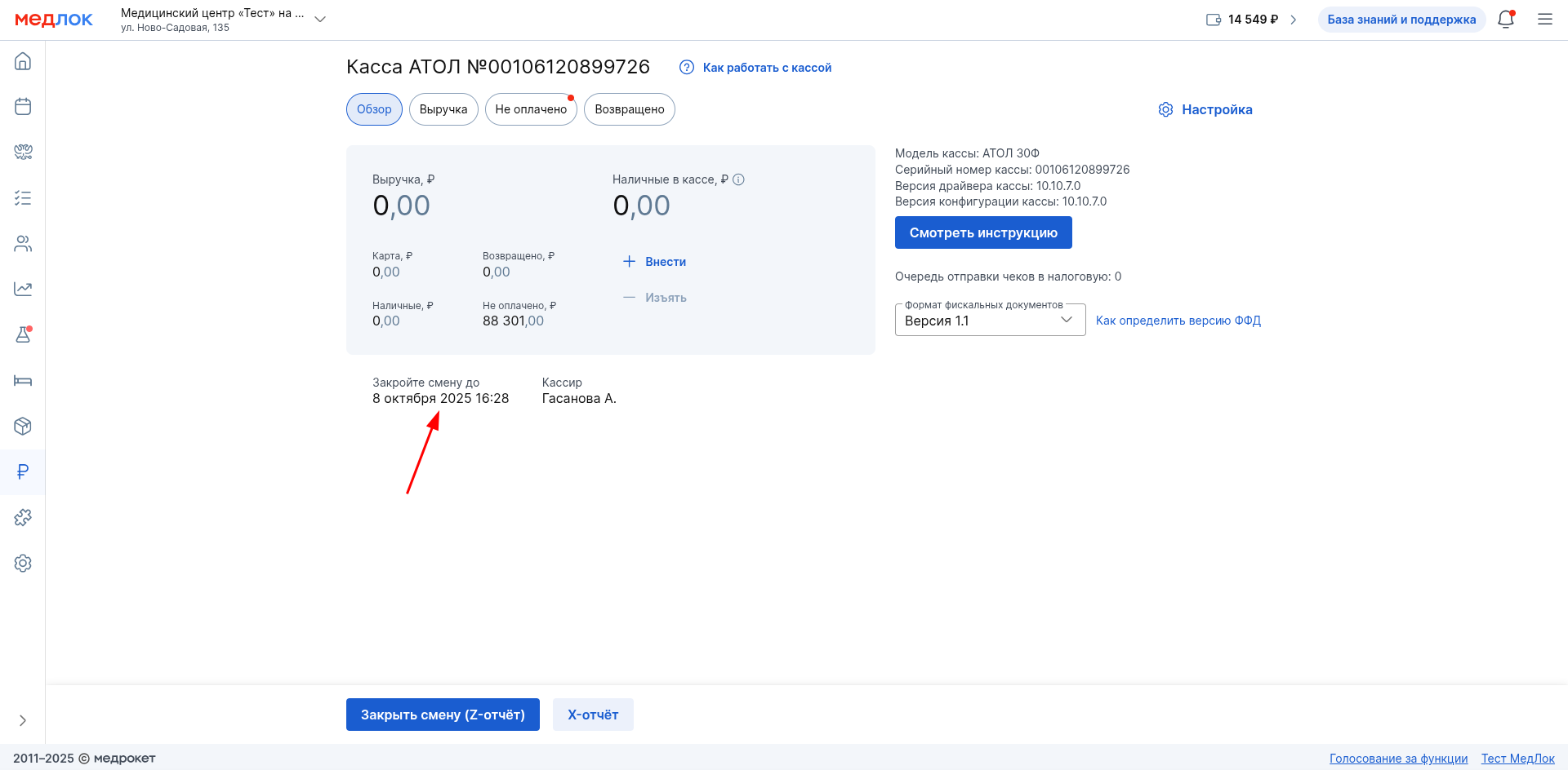 Для корректной работы рекомендуем открывать и закрывать смену, а также проводить оплаты только через МИС МедЛок.