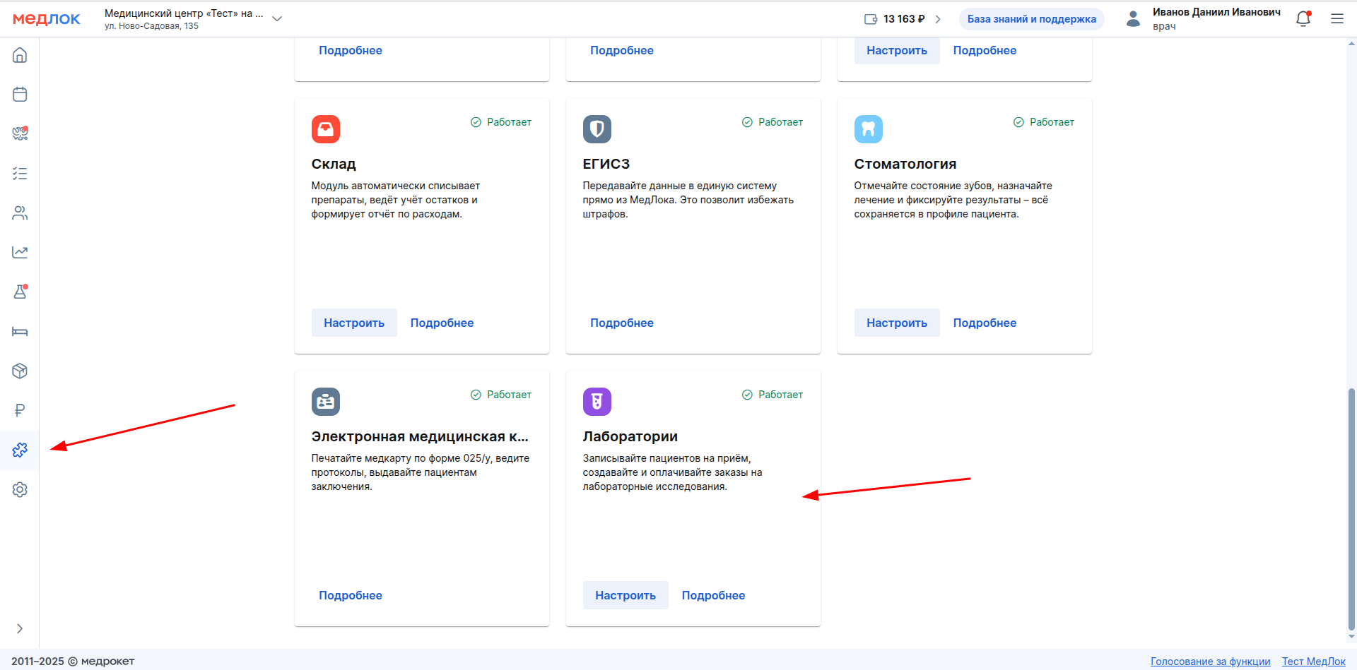 Для корректной работы модуля «Лаборатории» должны быть включены модули: «Касса», «Электронная медицинская карта» или «Стоматология».