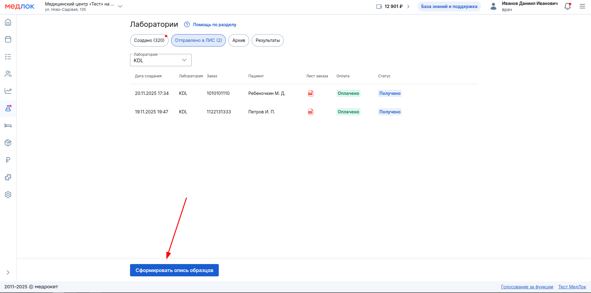 2. Нажмите «Оплатить и отправить в ЛИС».
