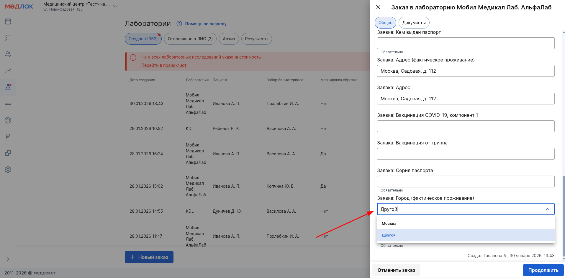 2. Если создаёте заказ в разделе Лаборатории