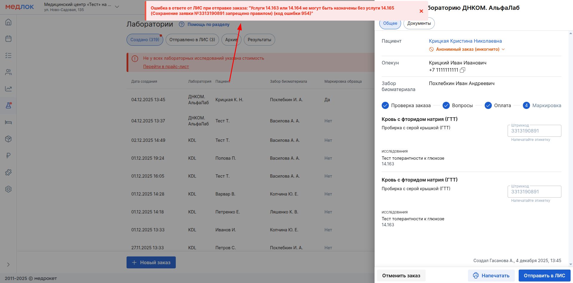 Если вы работаете с ЛИС ДНКОМ, то после печати штрихкодов и нажатия на «Отправить в ЛИС» вы можете столкнуться с ошибкой из-за того, что какое-либо исследование не может быть в одном заказе с другим. Или одно из исследований предполагает, что вместе с ним будет добавлено в заказ дополнительное.