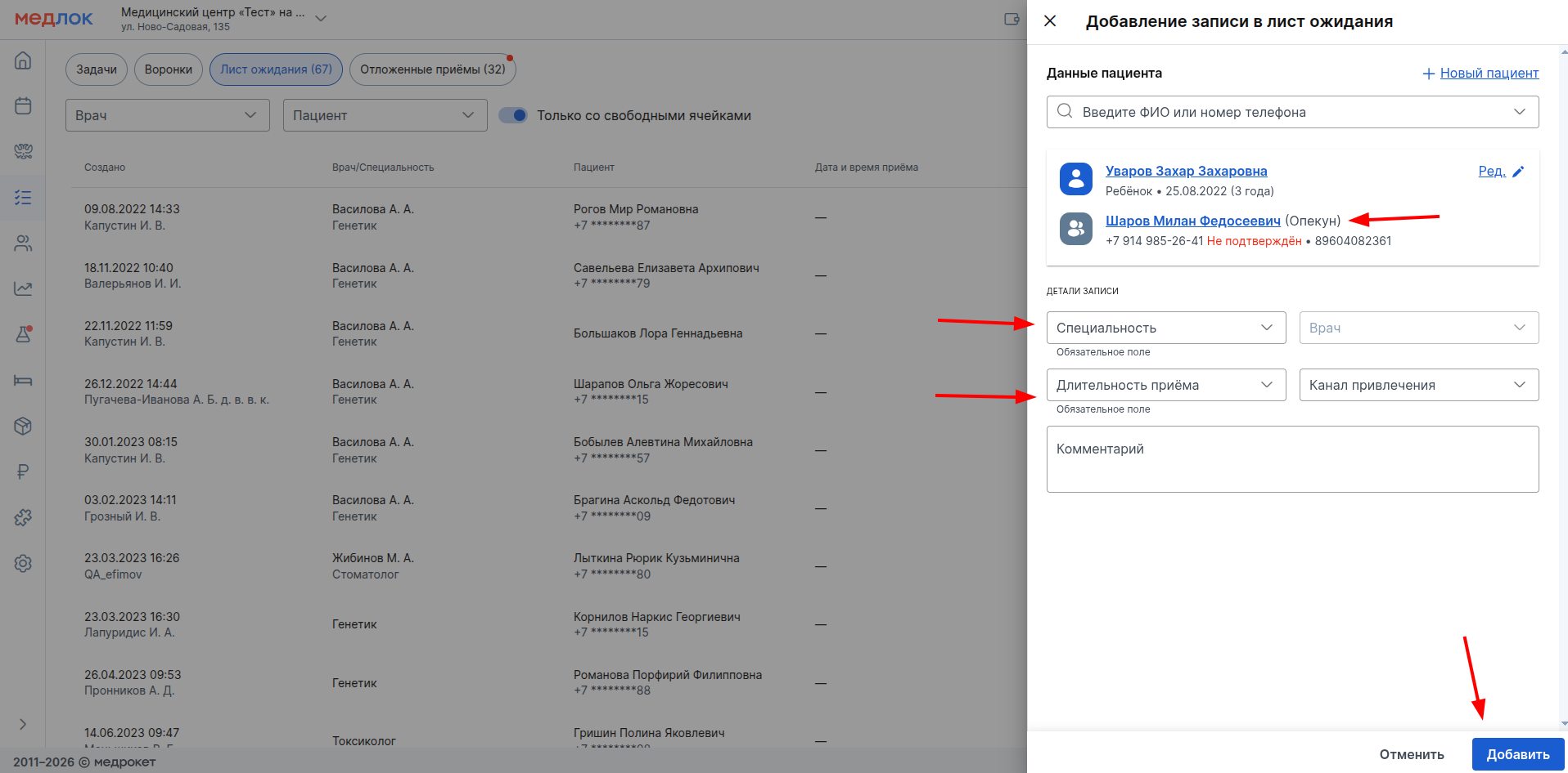 При добавлении несовершеннолетнего или недееспособного пациента в лист ожидания опекун подставится автоматически, сменить его нельзя. Если опекунов несколько, здесь будет отображаться последний привязанный опекун или тот, который был указан в предыдущем приёме.