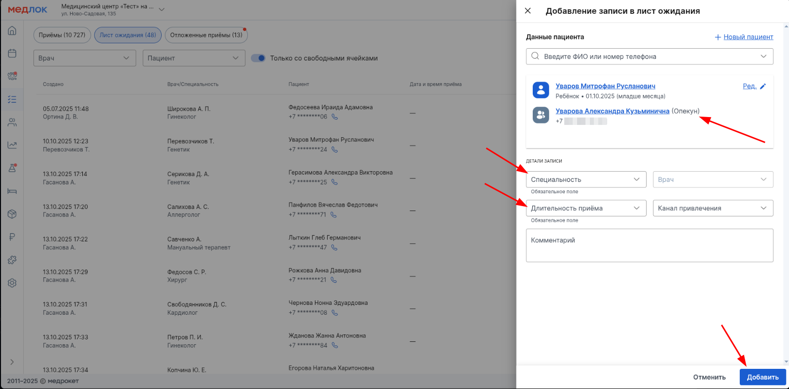Добавление записи в лист ожидания для несовершеннолетних или недееспособных пациентов работает так же, как и для взрослых: доступны переключатель «Поместить в лист ожидания» в записи на приём и добавление новой записи в лист ожидания напрямую.