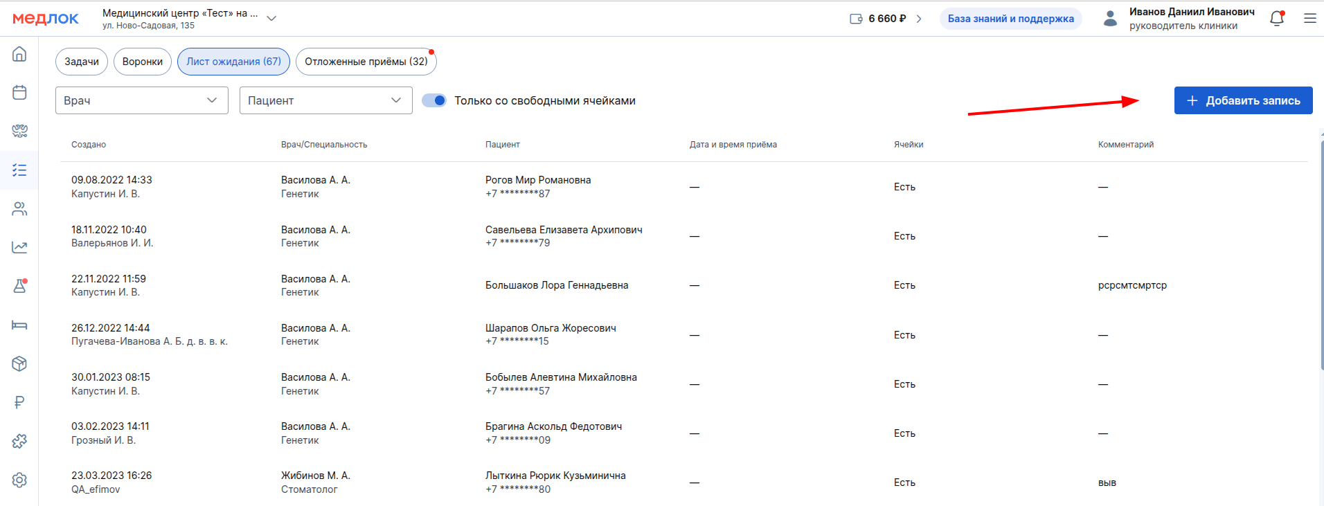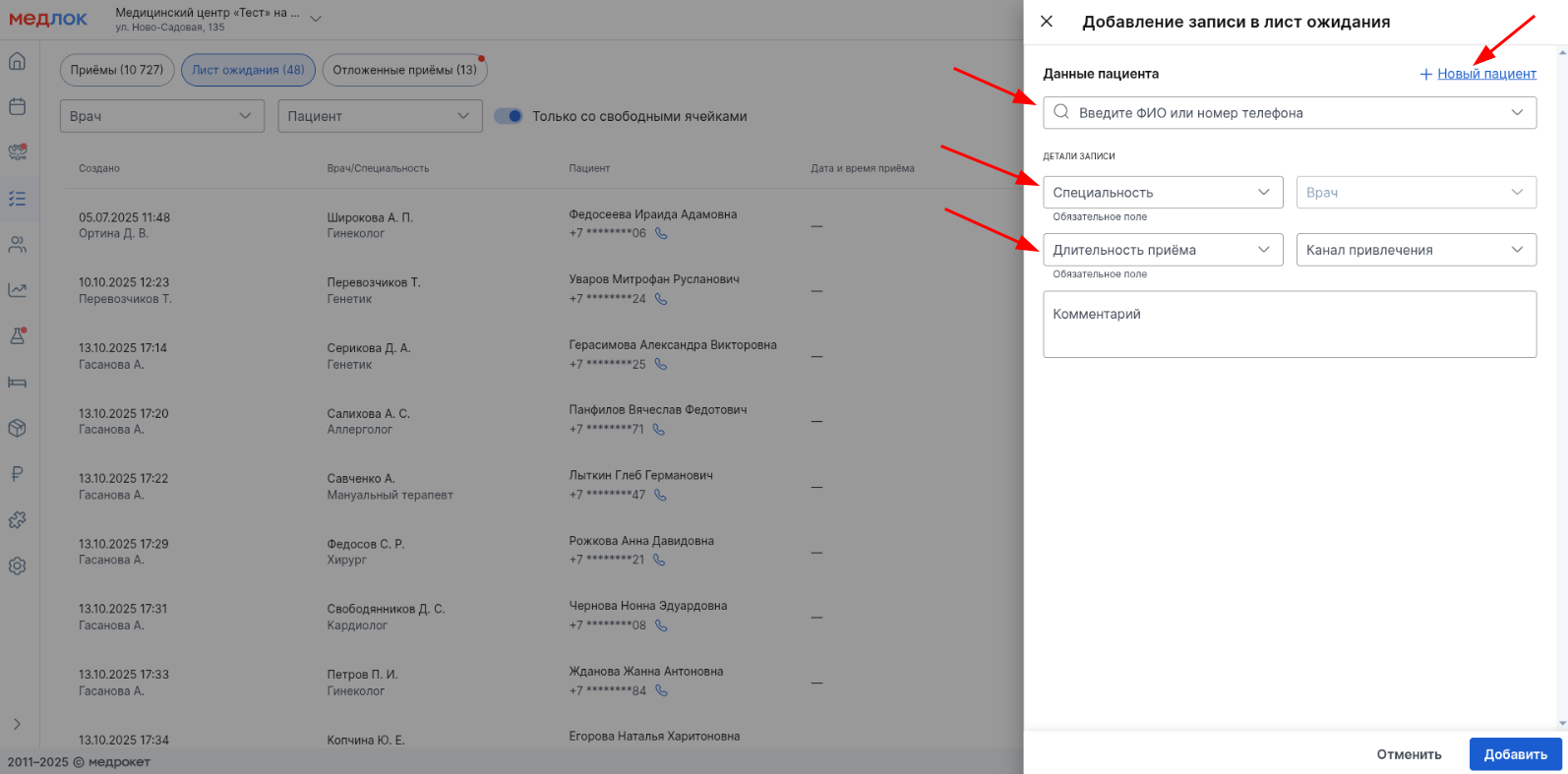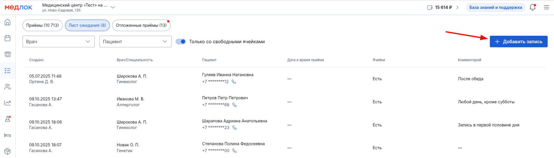 Для добавления записи в лист ожидания нажмите «+ Добавить запись».