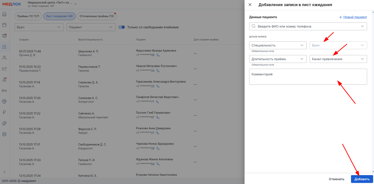 3. По желанию укажите ФИО врача, канал привлечения и напишите комментарий к записи.
