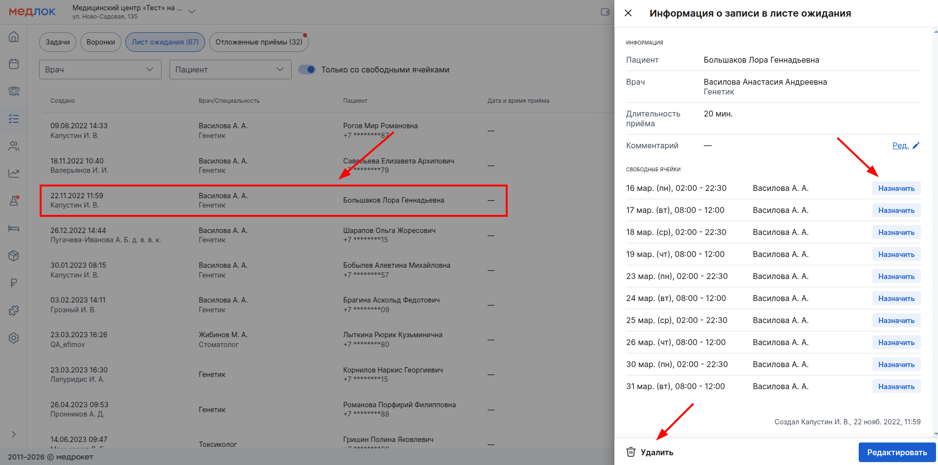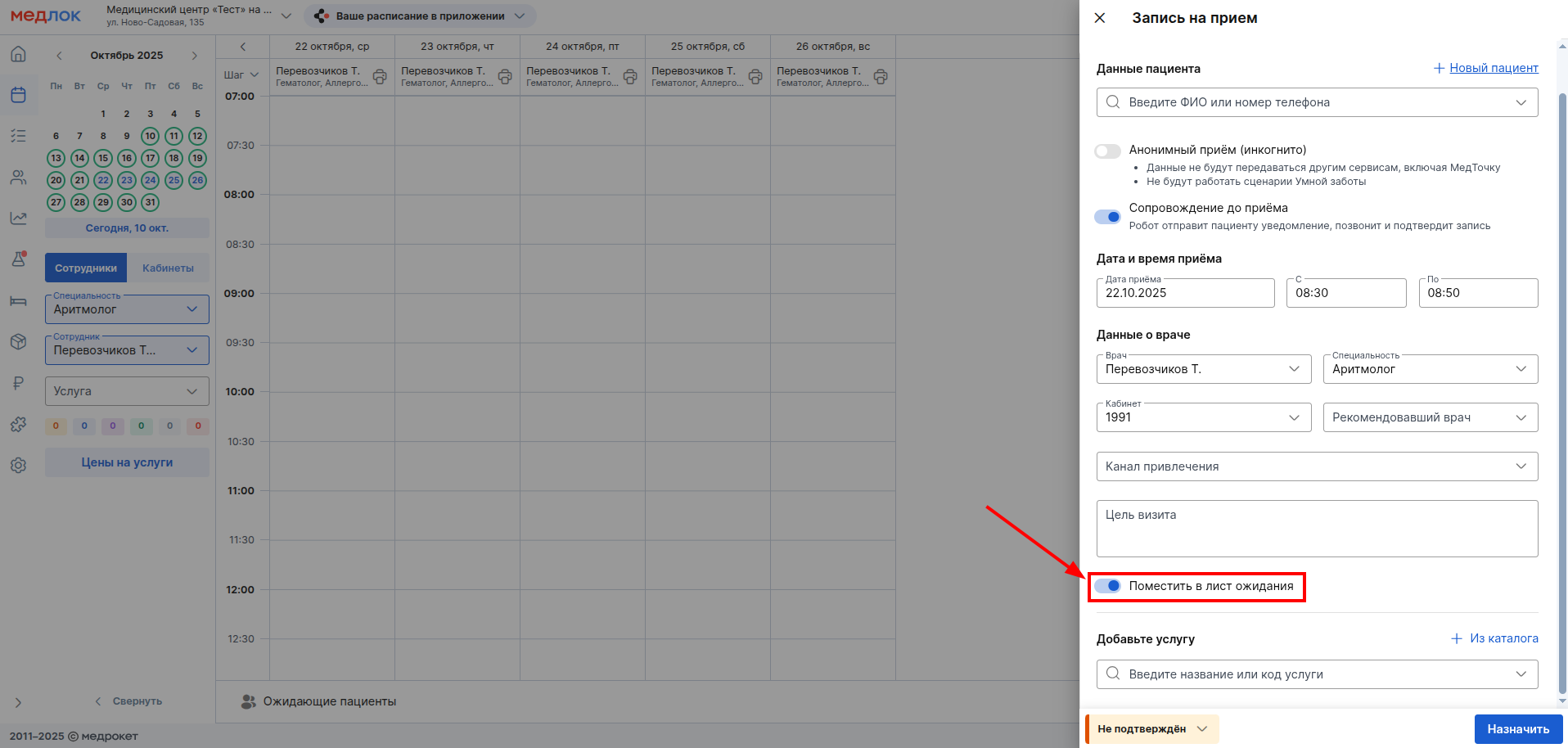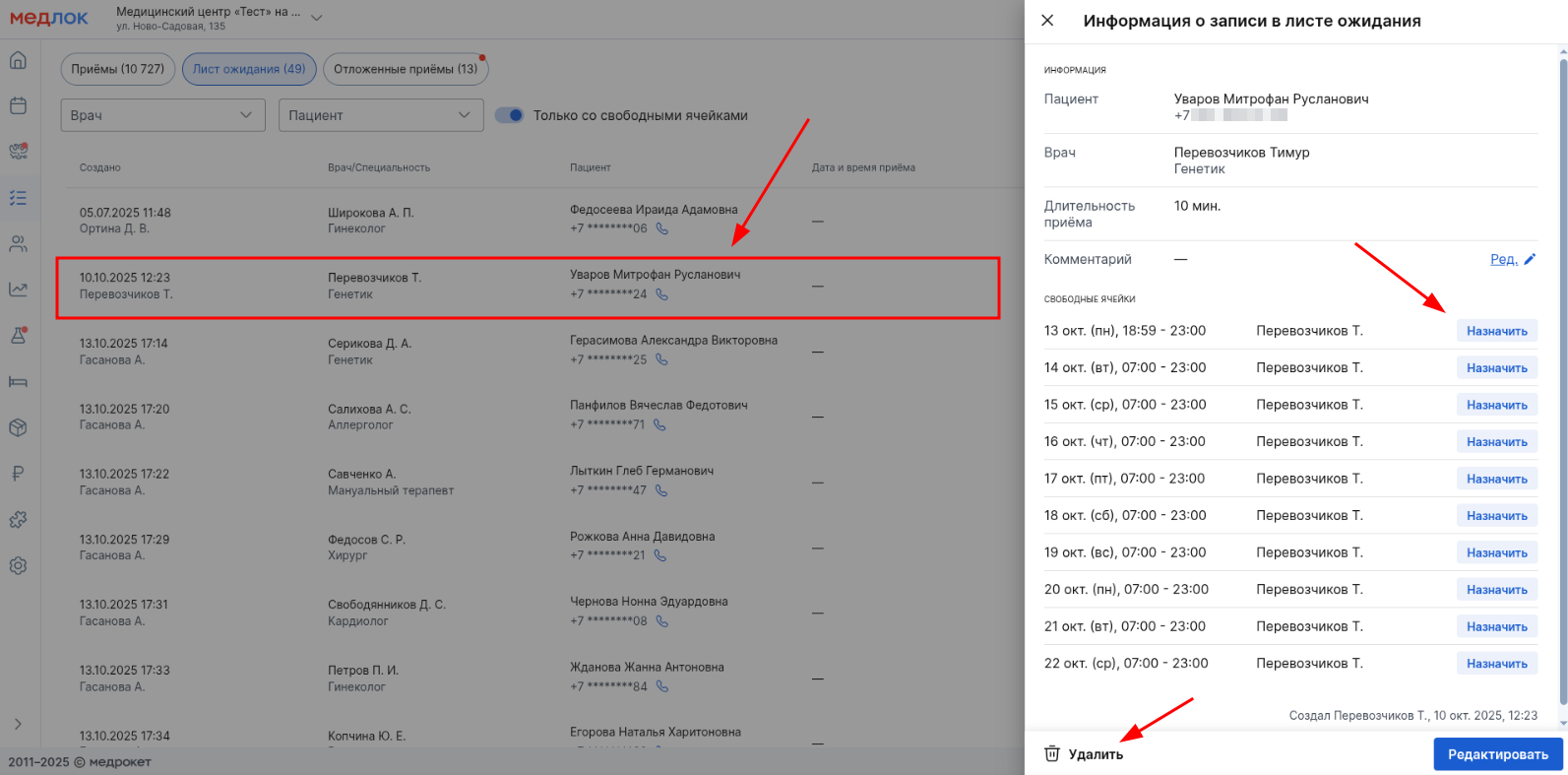 После назначения этот приём появится в сетке расписания на выбранную дату и время, а строка в листе ожидания исчезнет.