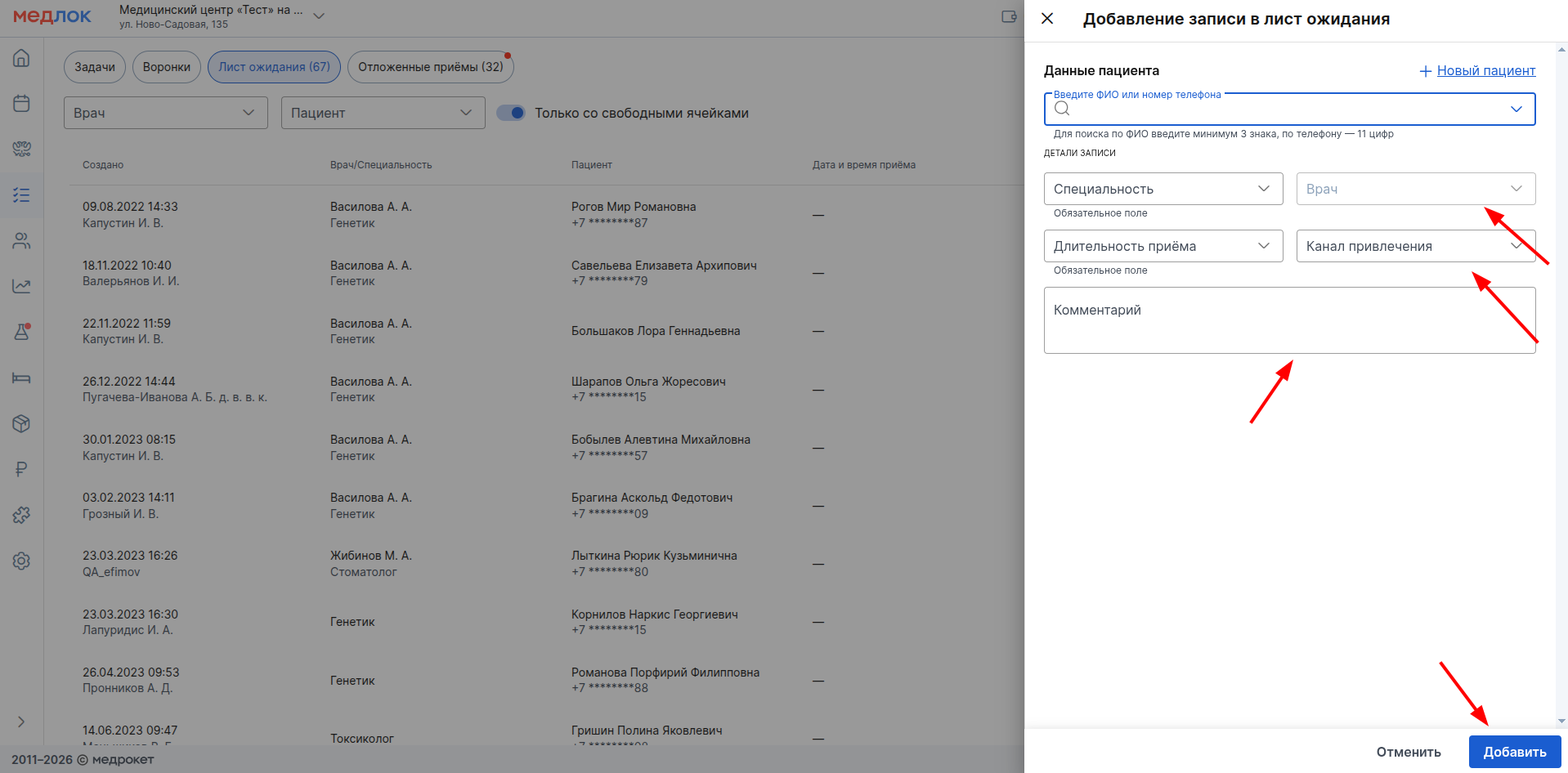 - По желанию укажите ФИО врача, канал привлечения и напишите комментарий к записи.