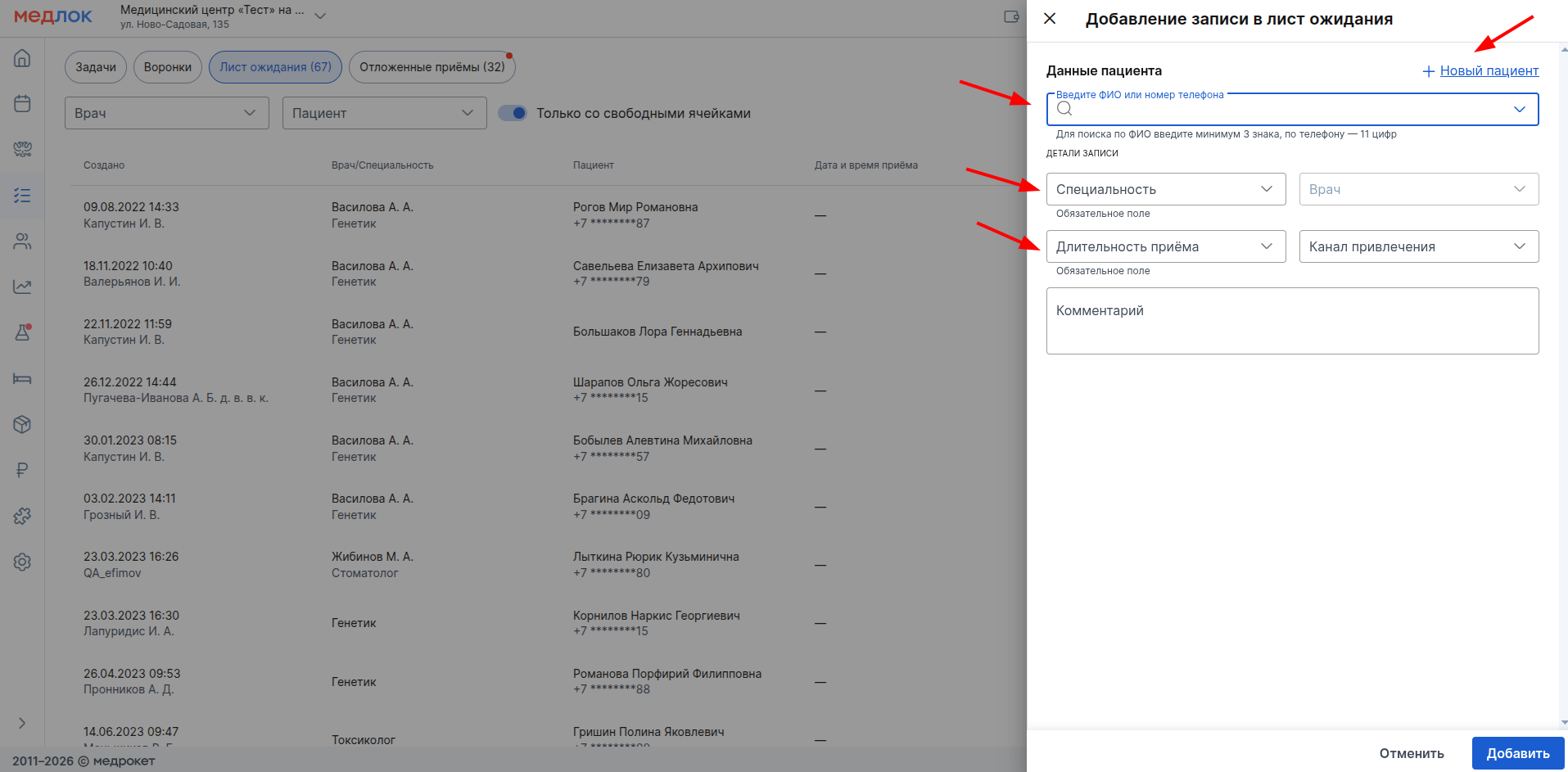 - В открывшемся окне выберите пациента или создайте нового. Укажите специальность врача и длительность приёма.