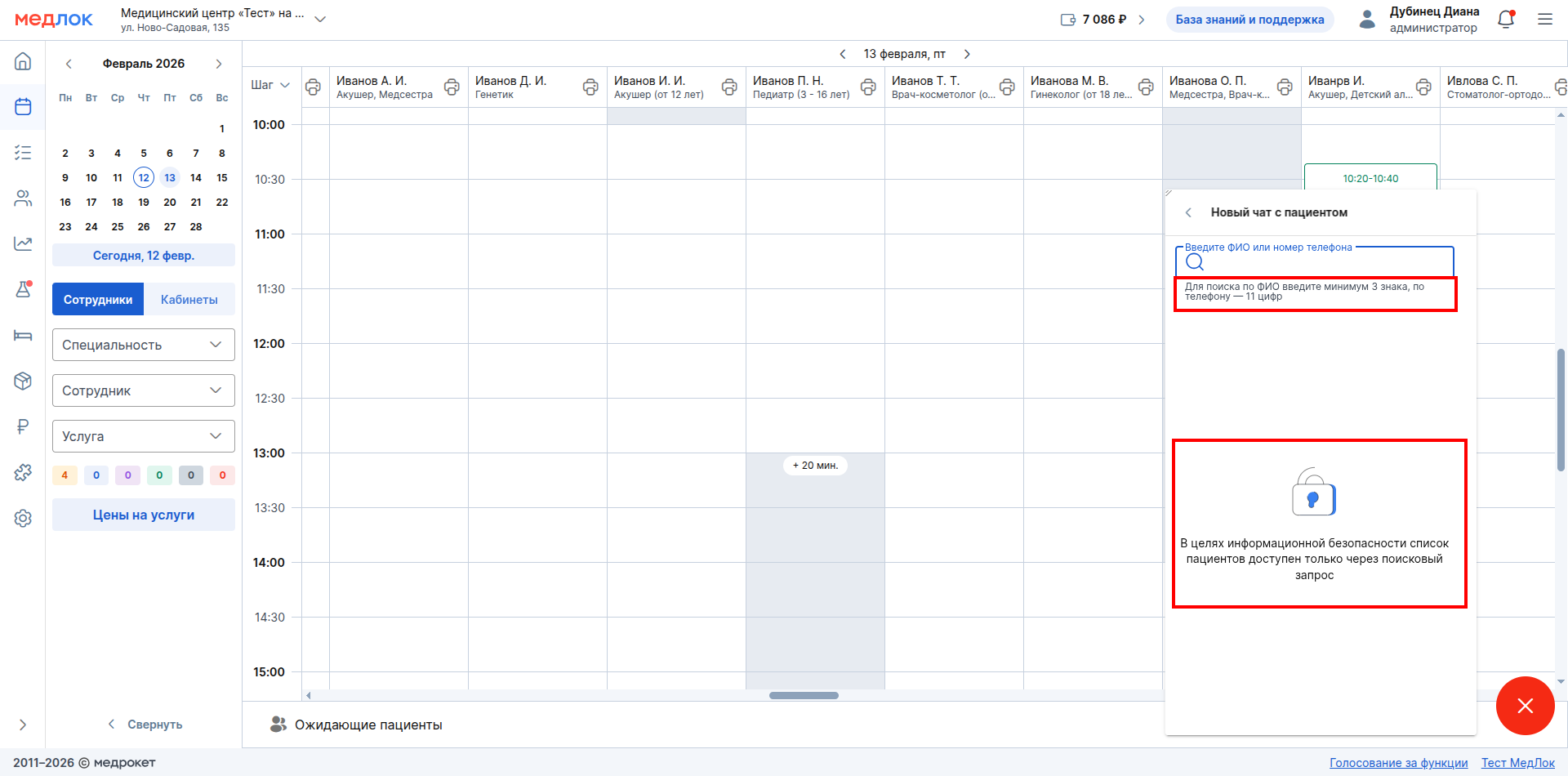 Для обеспечения информационной безопасности список пациентов доступен только через поисковый запрос. Чтобы начать искать по ФИО, нужно ввести минимум 3 символа. Для поиска по номеру телефона нужно ввести минимум 11 цифр.