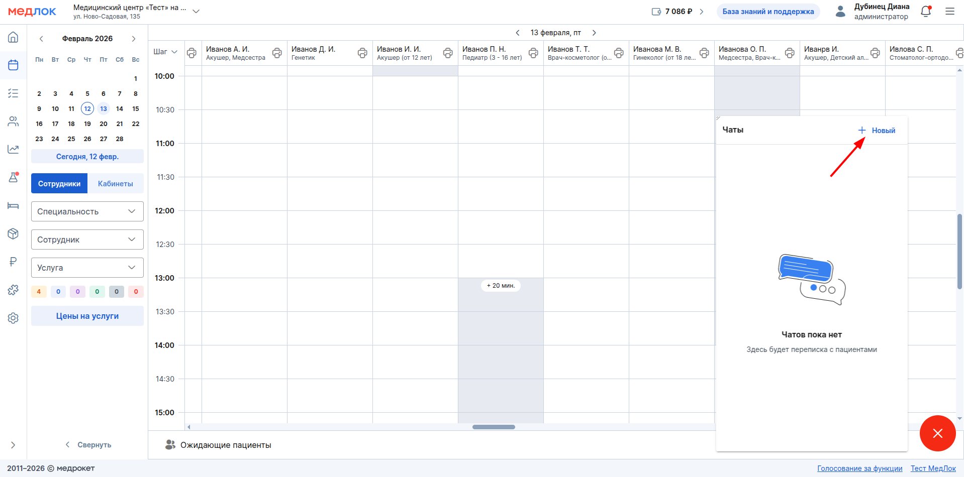 Чтобы начать чат с пациентом, нажмите на «+ Новый» в правом верхнем углу.