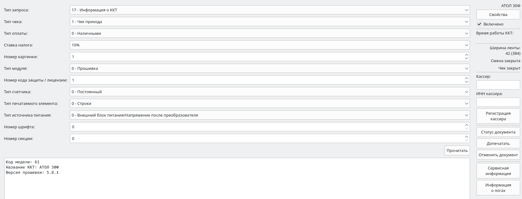 Либо проверить в «драйвере ККТ» в разделе «Информация о ККТ» в строке «Код модели». На скриншоте ниже видно, что у кассы АТОЛ 30Ф код модели 61 или 061: