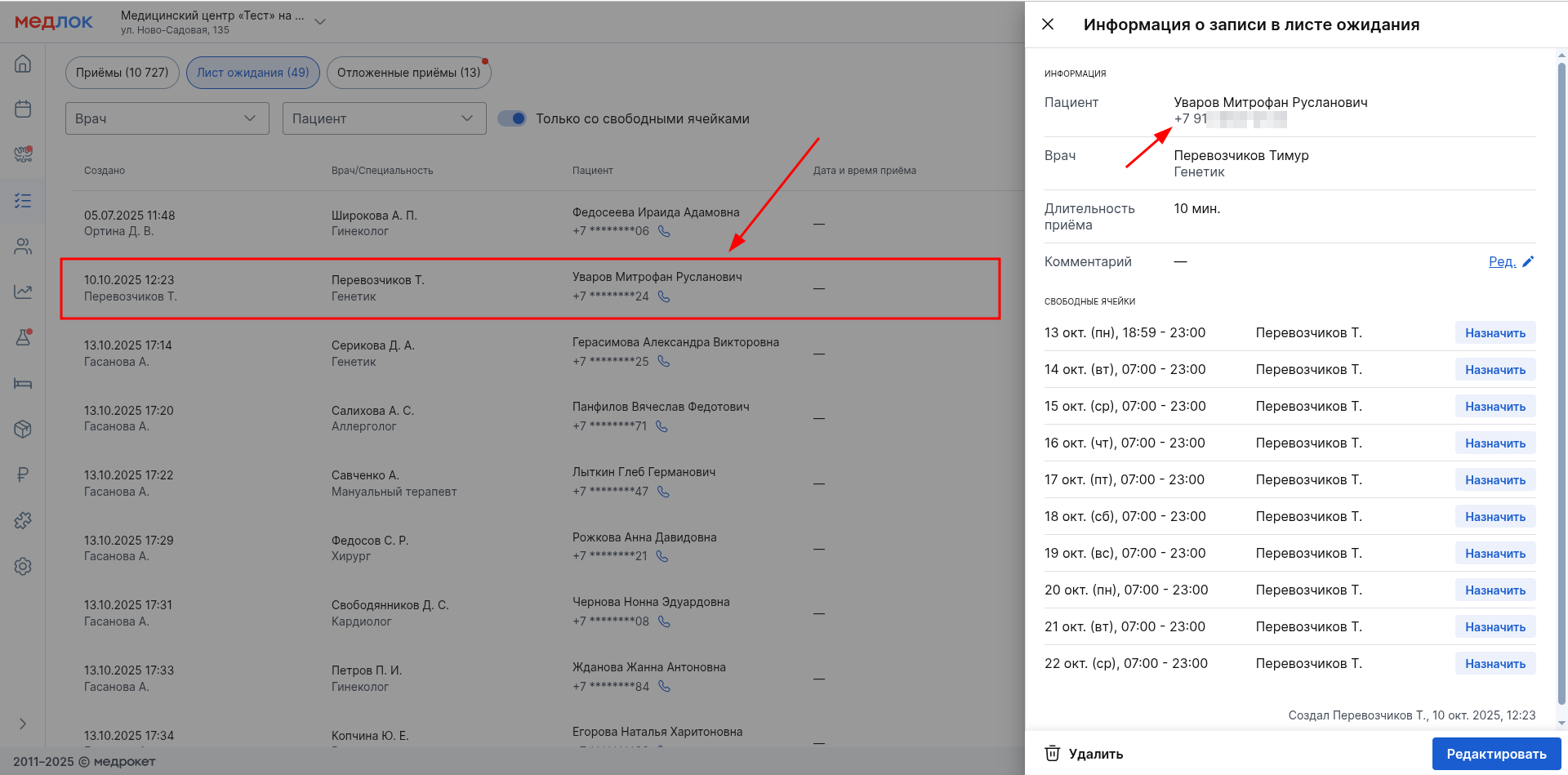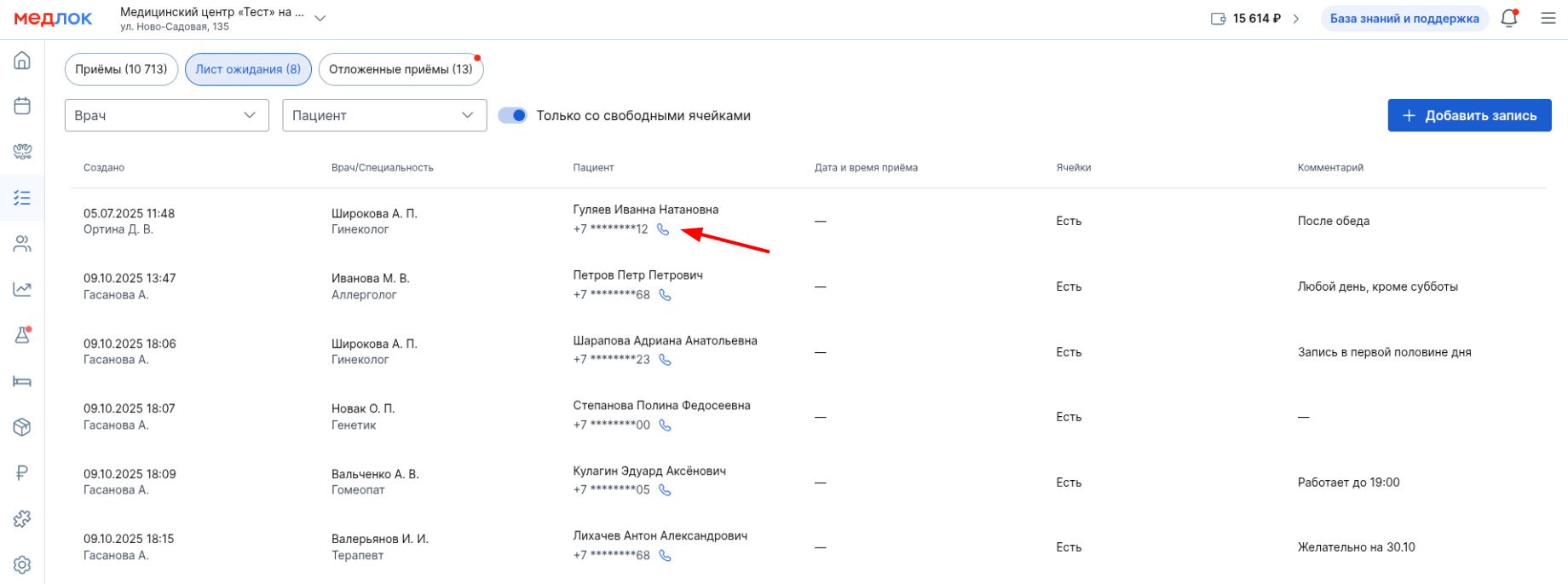 номера телефонов пациентов в общем списке. Чтобы увидеть номер телефона пациента, нужно нажать на строку с записью: