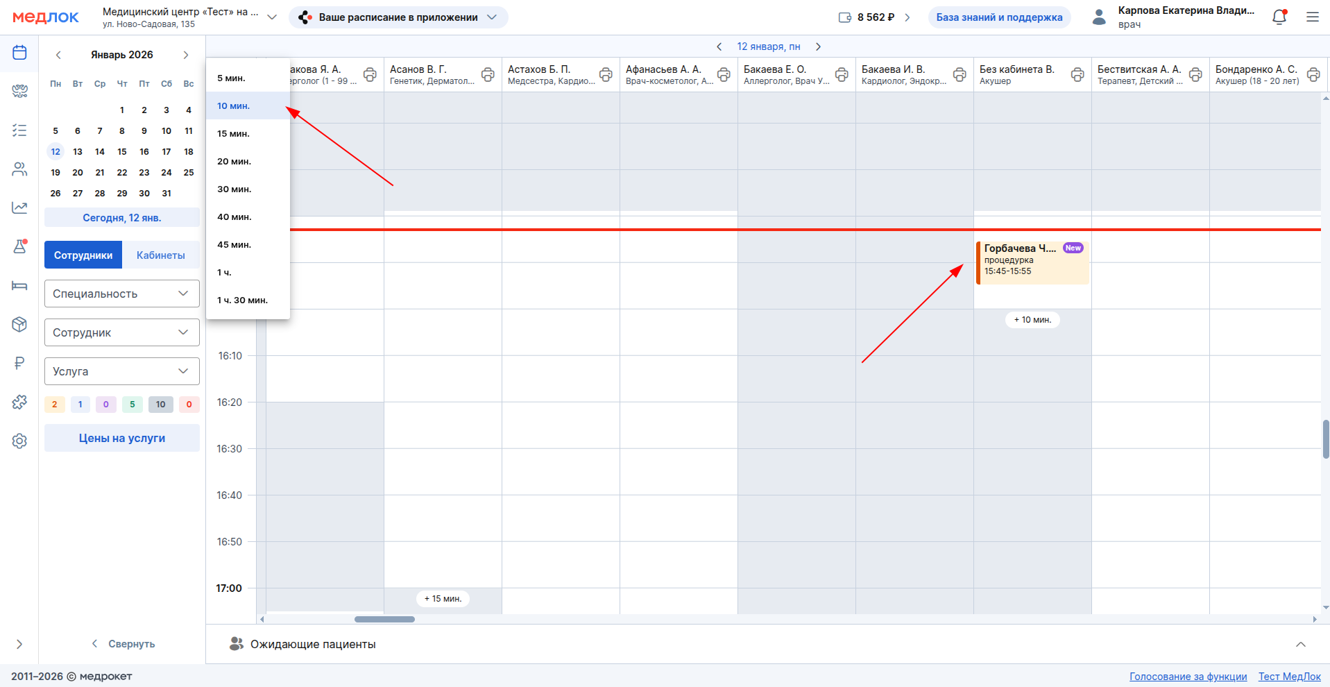 В самом низу расписания есть кнопка «+ N мин.», которая позволяет расширить расписание врача в этот конкретный день.