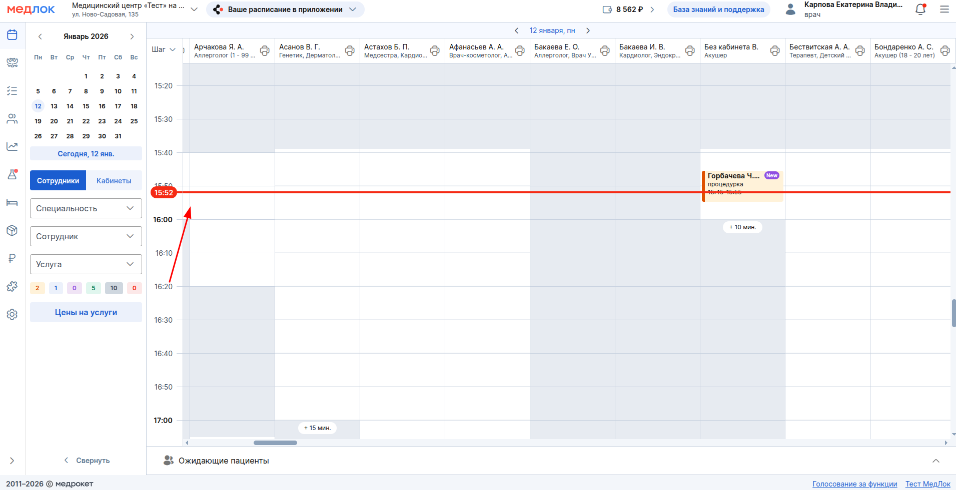 Расписание формируется на основании графиков, добавленных врачам в клинике. По умолчанию, оно показывает работу всех доступных специалистов на текущий день.