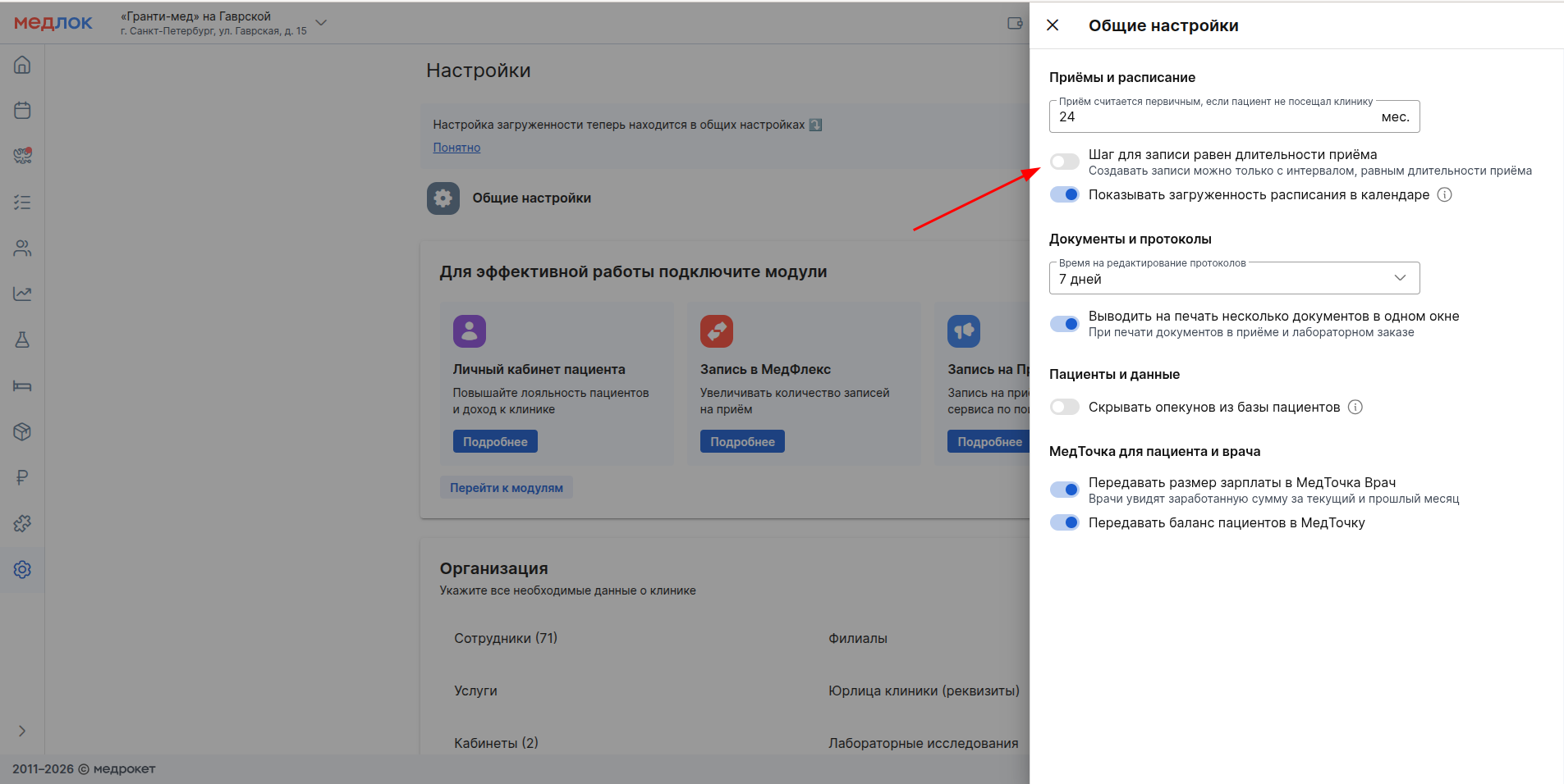 Изменить количество месяцев для первичности приёма можно перейдя в «Настройки», далее нажав на «Общие настройки». Вы можете настроить удобную для вашей клиники длительность от 1 до 24 месяцев.