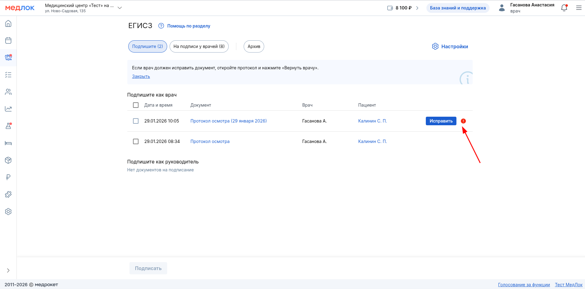 В таком случае, вы увидите восклицательный знак напротив документа в разделе «ЕГИСЗ». Наведите на него курсор мыши и появится кнопка «Исправить».