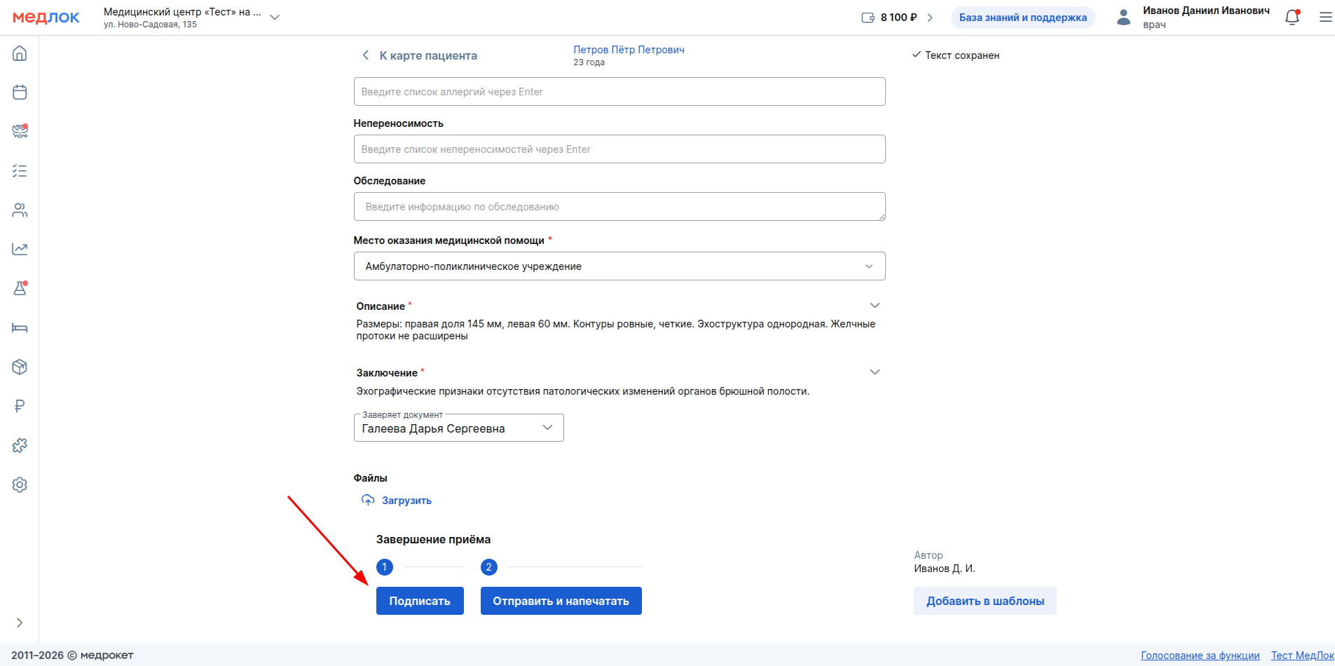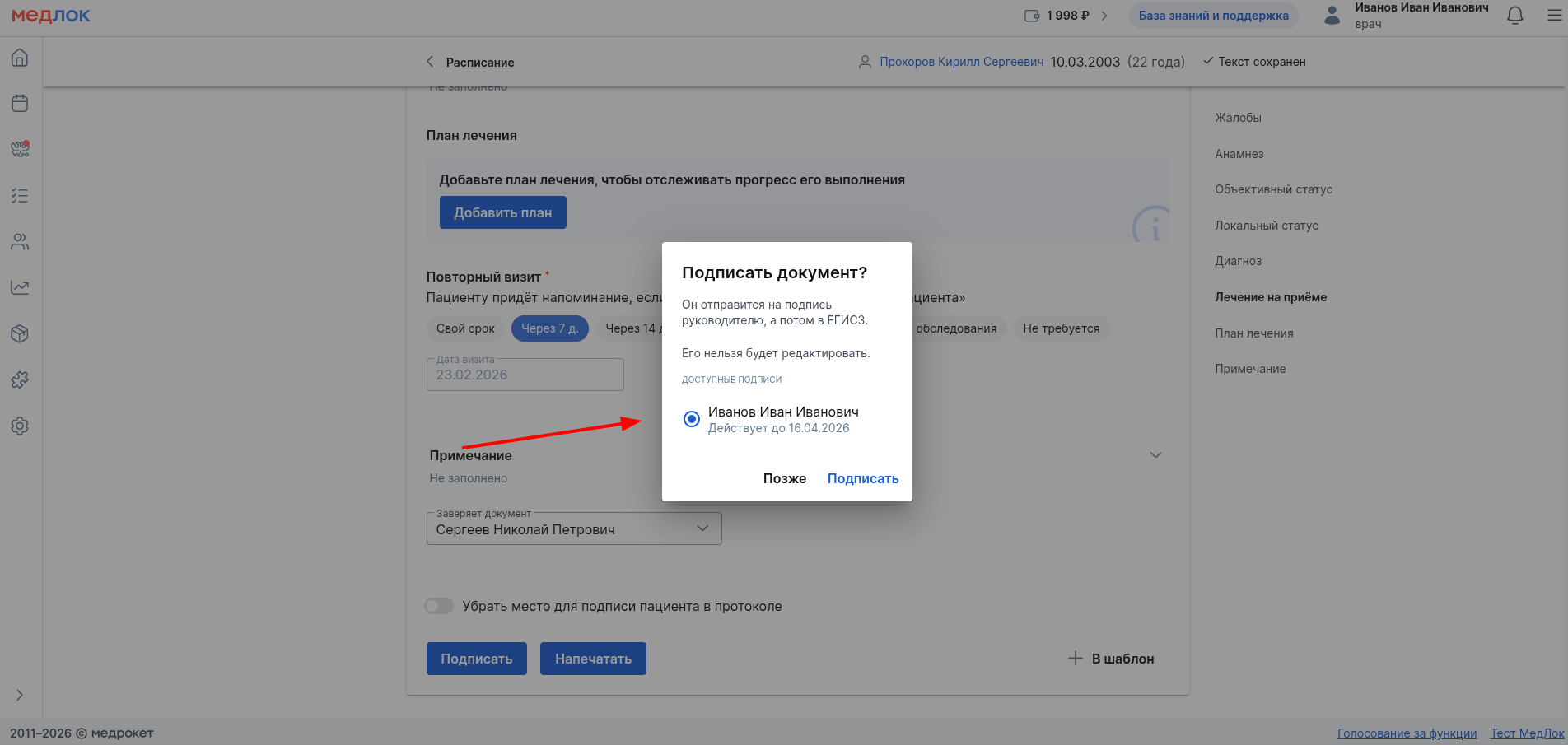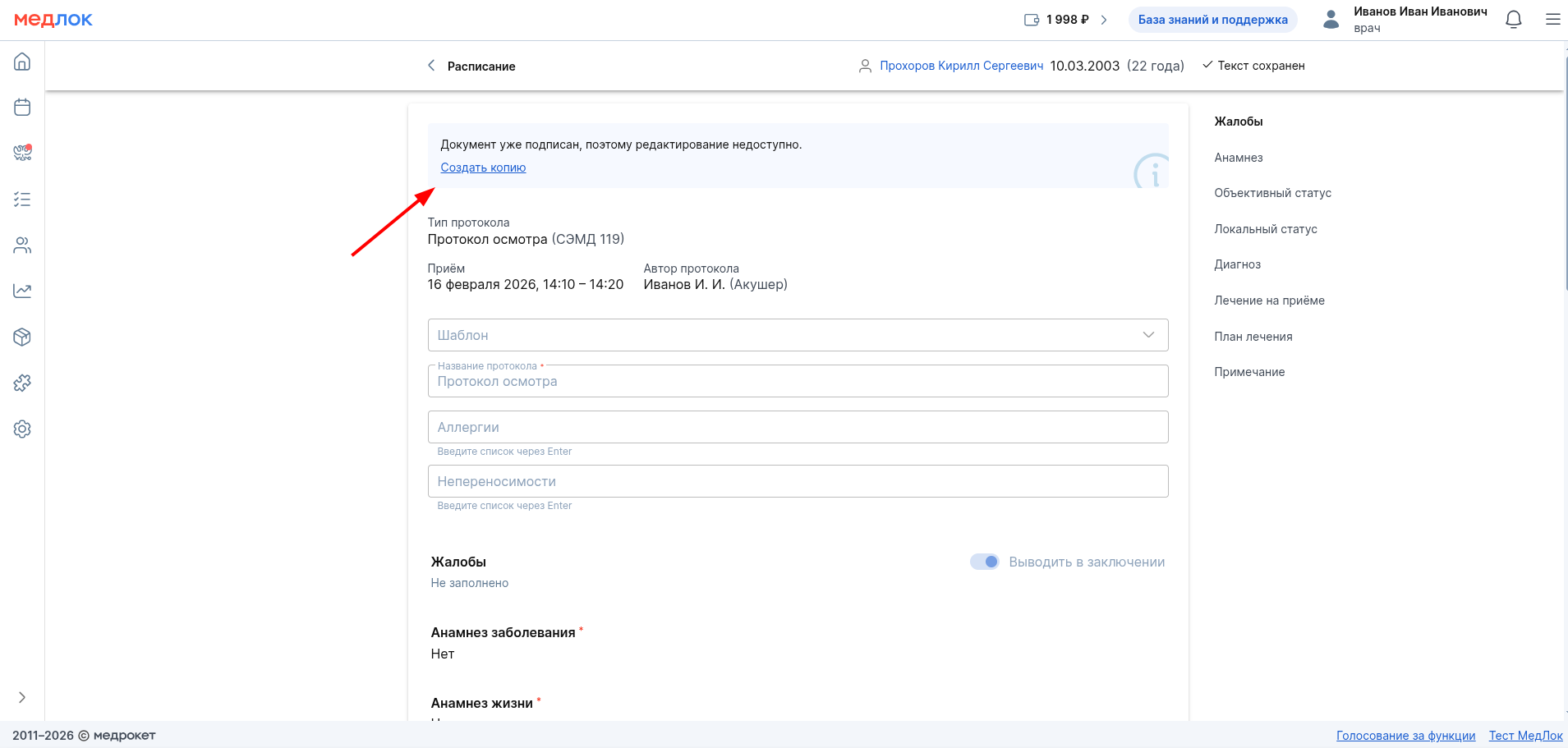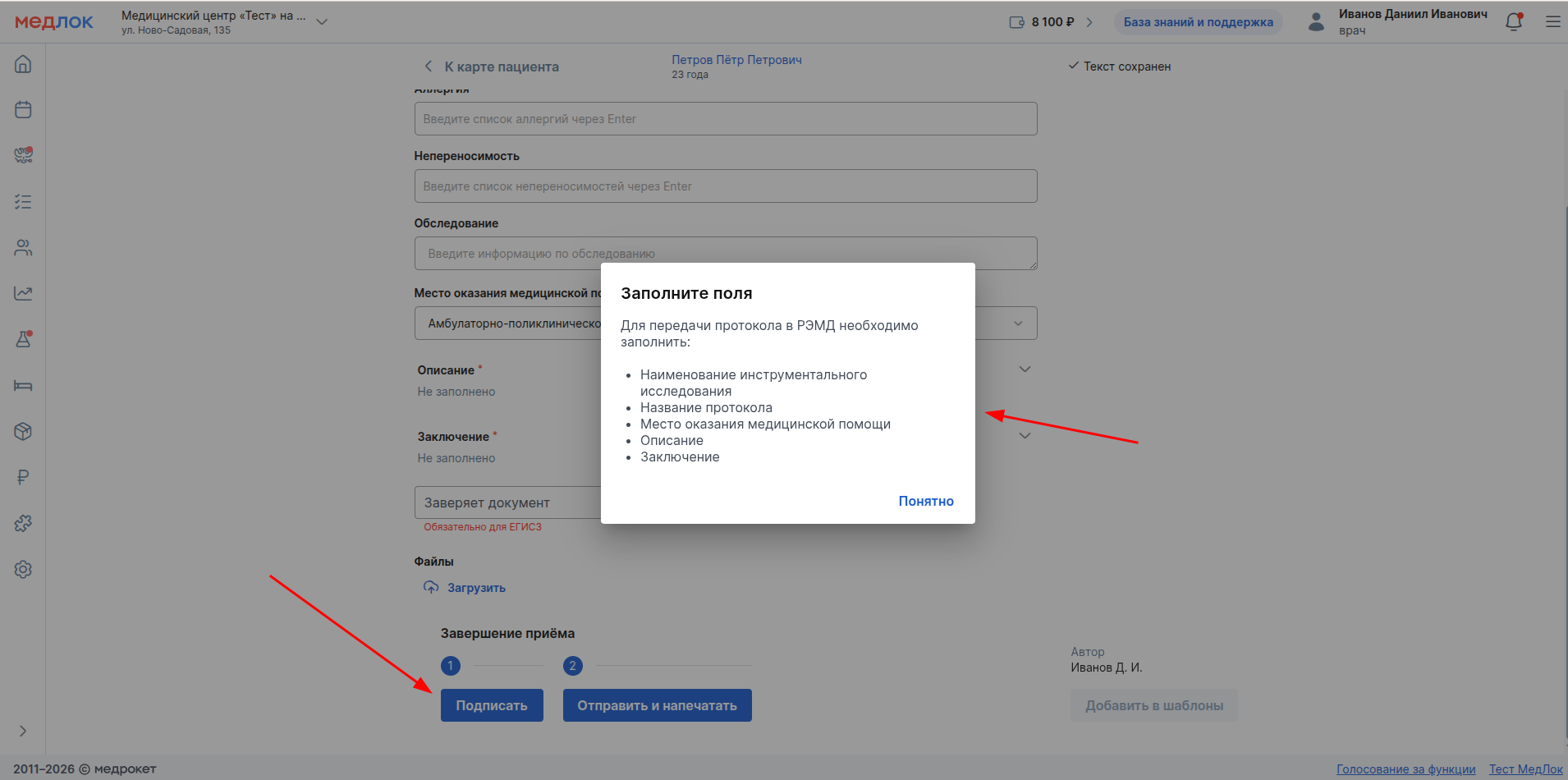 Создание и подписание протокола осмотра врачом