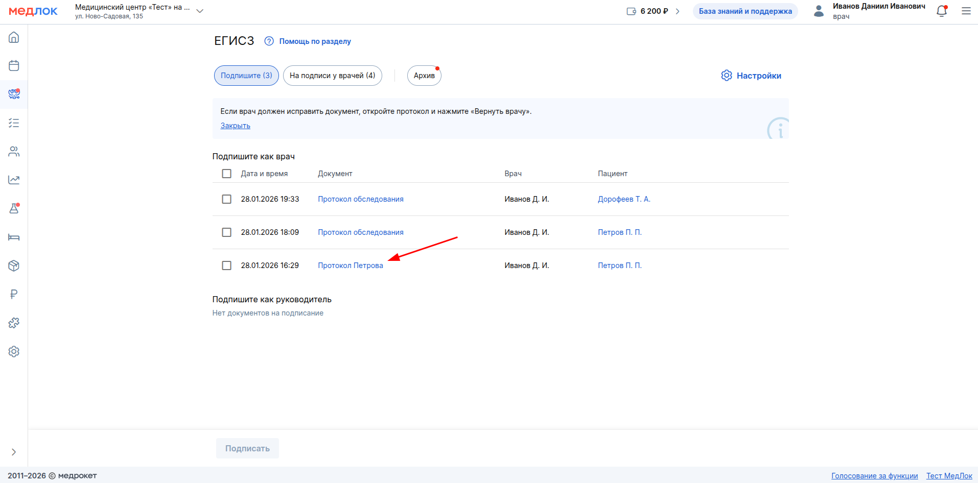 После этого протокол перейдёт на подпись руководителю клиники.