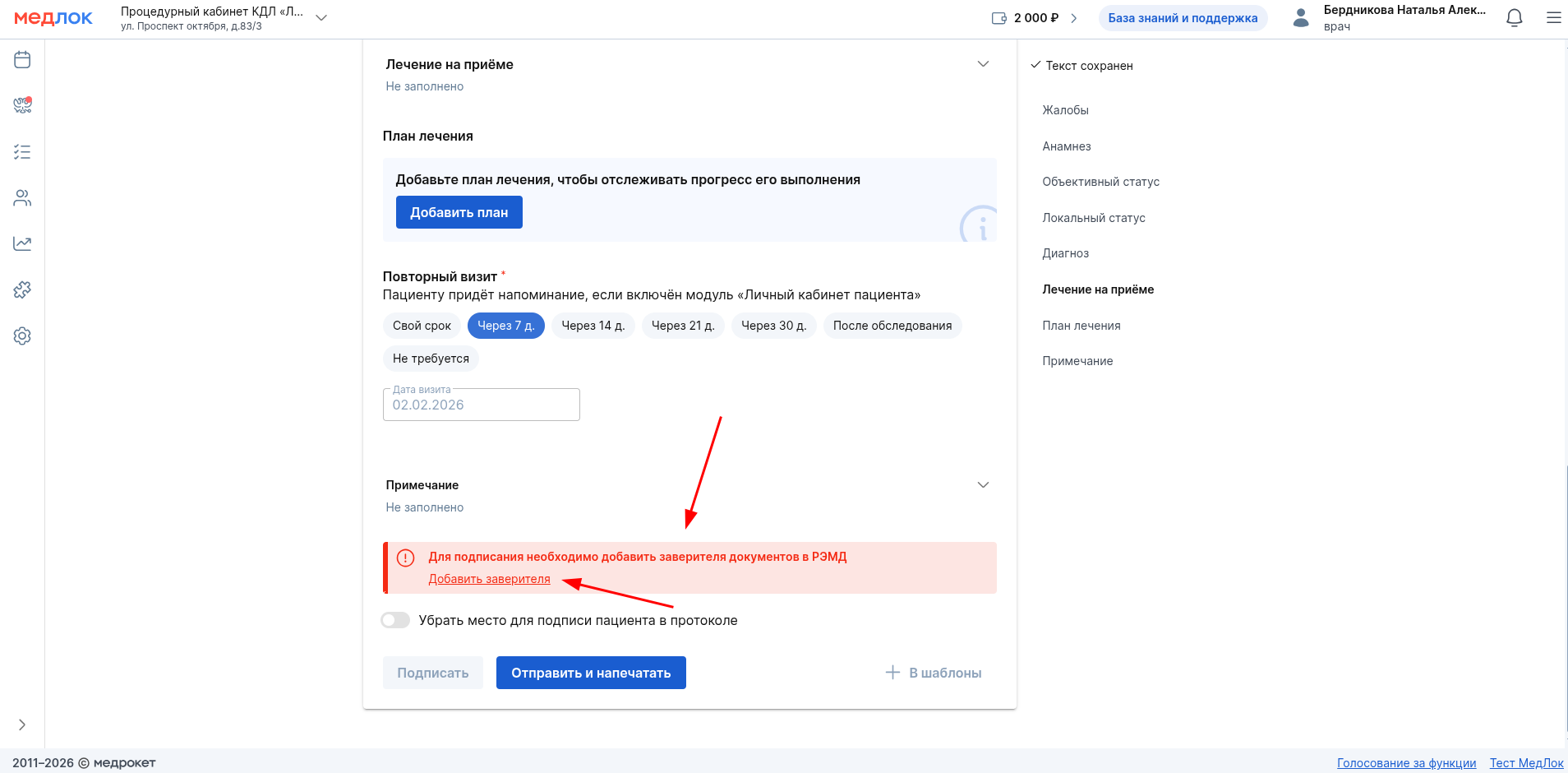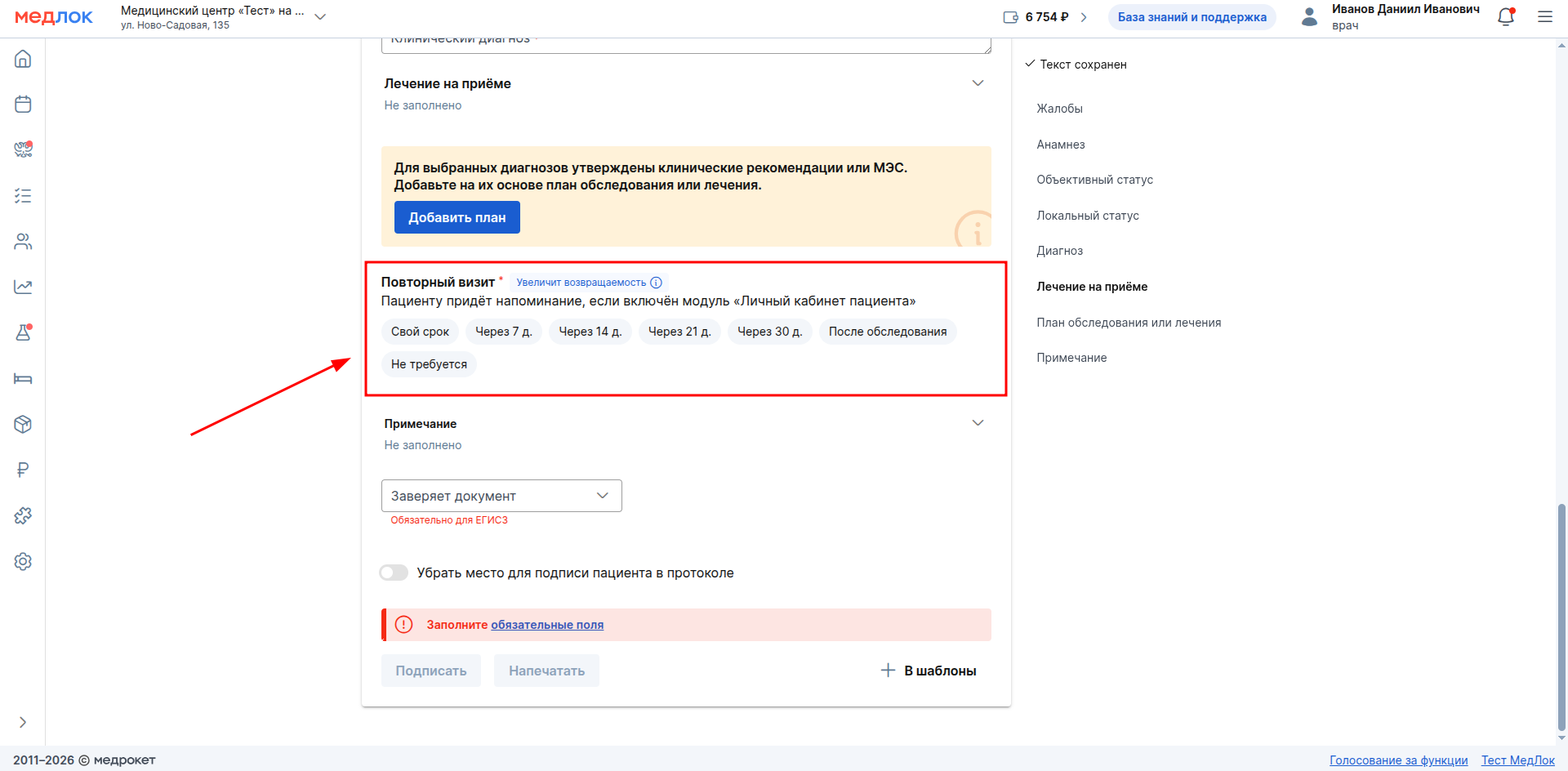 - При создании протокола обязательно укажите дату повторного визита или выберите вариант «Не требуется».