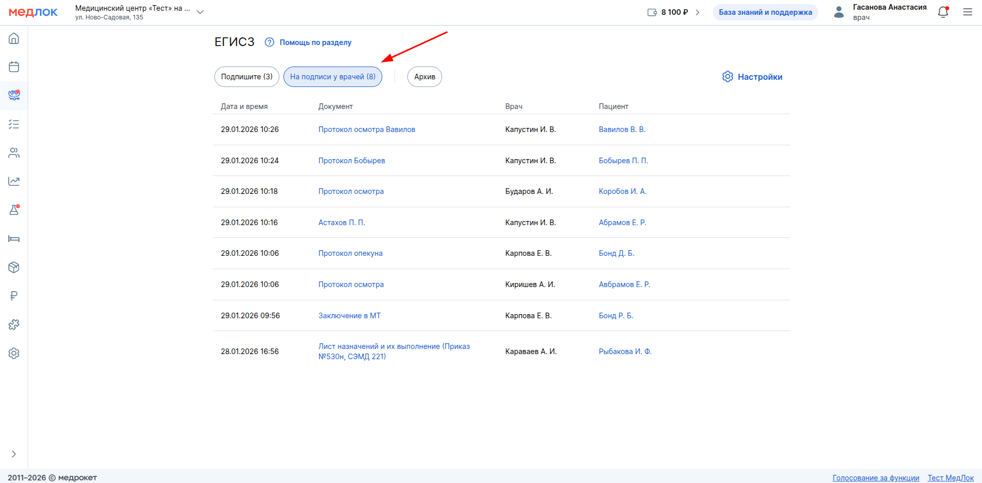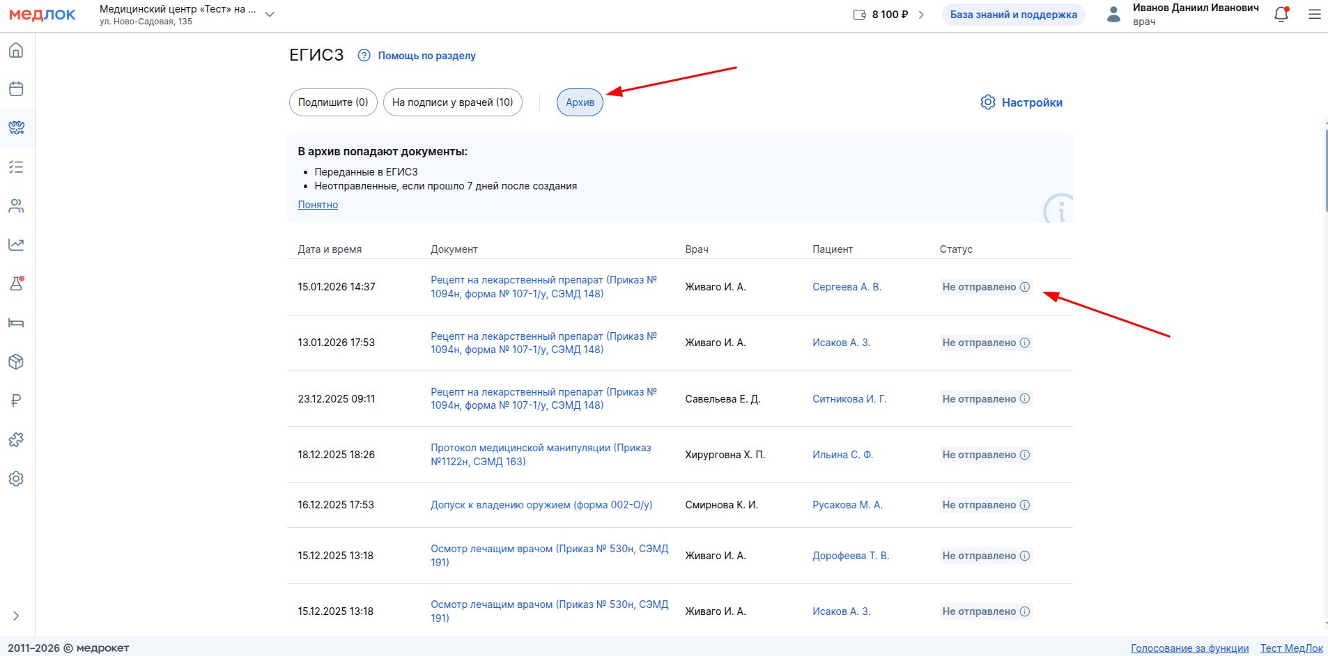 В разделе «Архив» находятся документы, которые были подписаны и отправлены в ЕГИСЗ. Напротив документа будет один из статусов: «Передано в ЕГИСЗ», «В процессе» или «Ошибка».