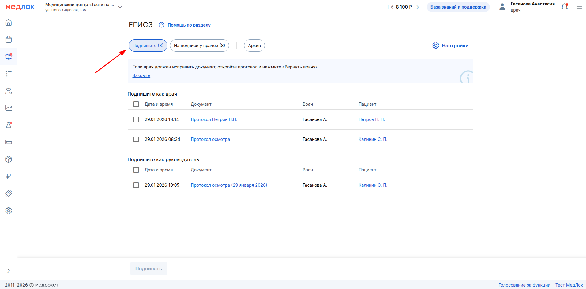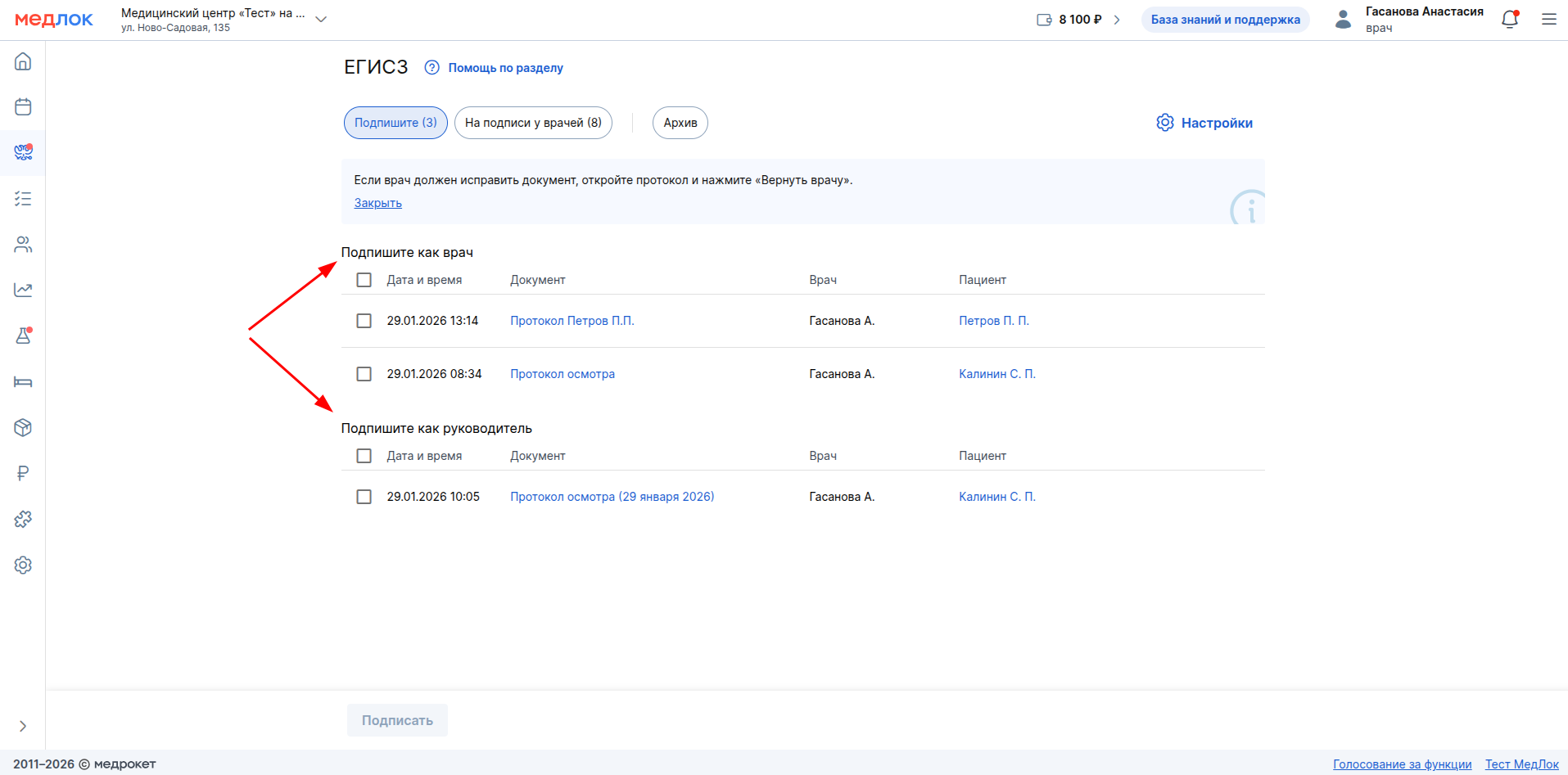 В разделе «Подпишите» находятся документы, ожидающие вашей подписи. Они разделены на две части: те, которые нужно подписать, как врач, и те, которые вам нужно подписать как руководитель.