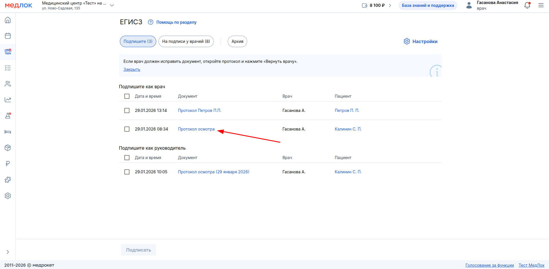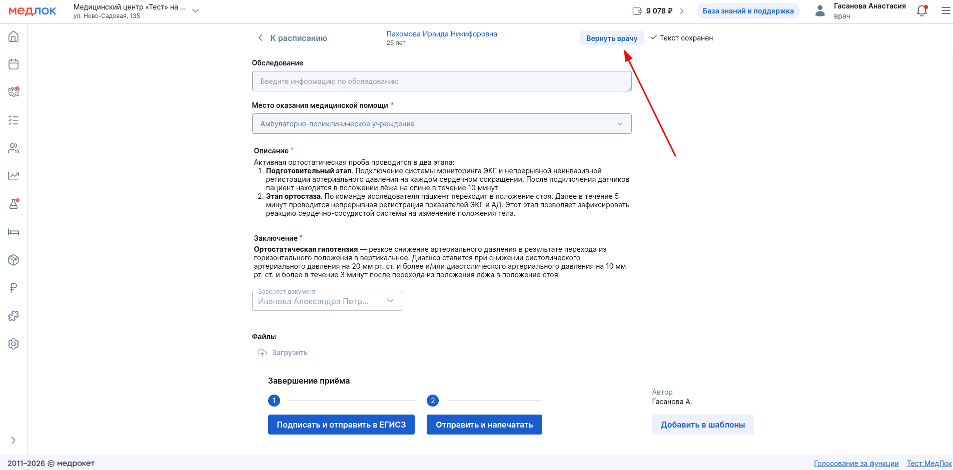 Если в протоколе обследования или другом СЭМДе, который попал к вам на подпись, есть неточности или недоработки, его можно вернуть врачу на исправление. Нажмите на кнопку «Вернуть врачу» вверху страницы протокола.