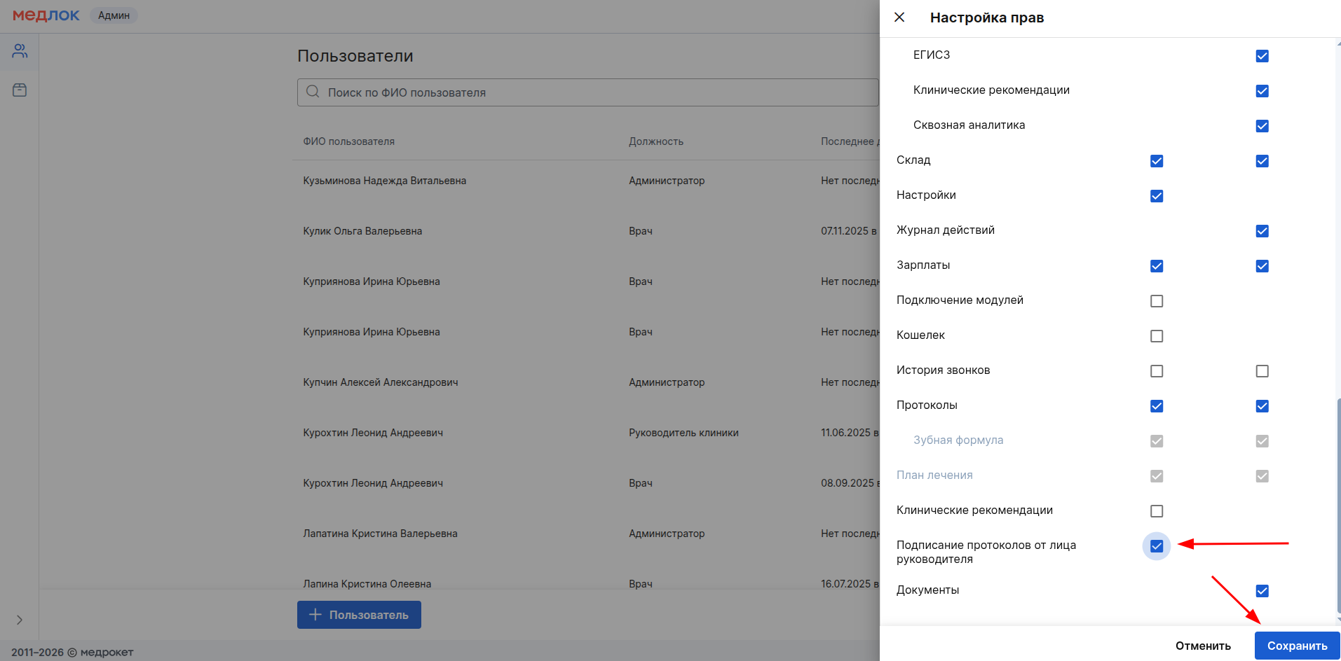Подробнее о выдаче прав пользователям читайте в статье Авторизация в МедЛок.