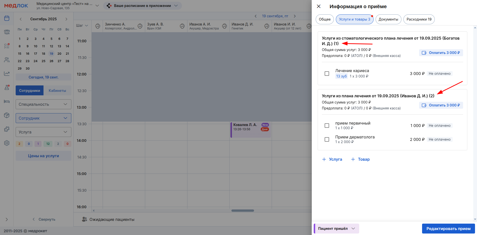 2. Цифры в скобках в конце названия плана лечения - это количество услуг, которые были назначены пациенту в этом приёме из этого плана.
