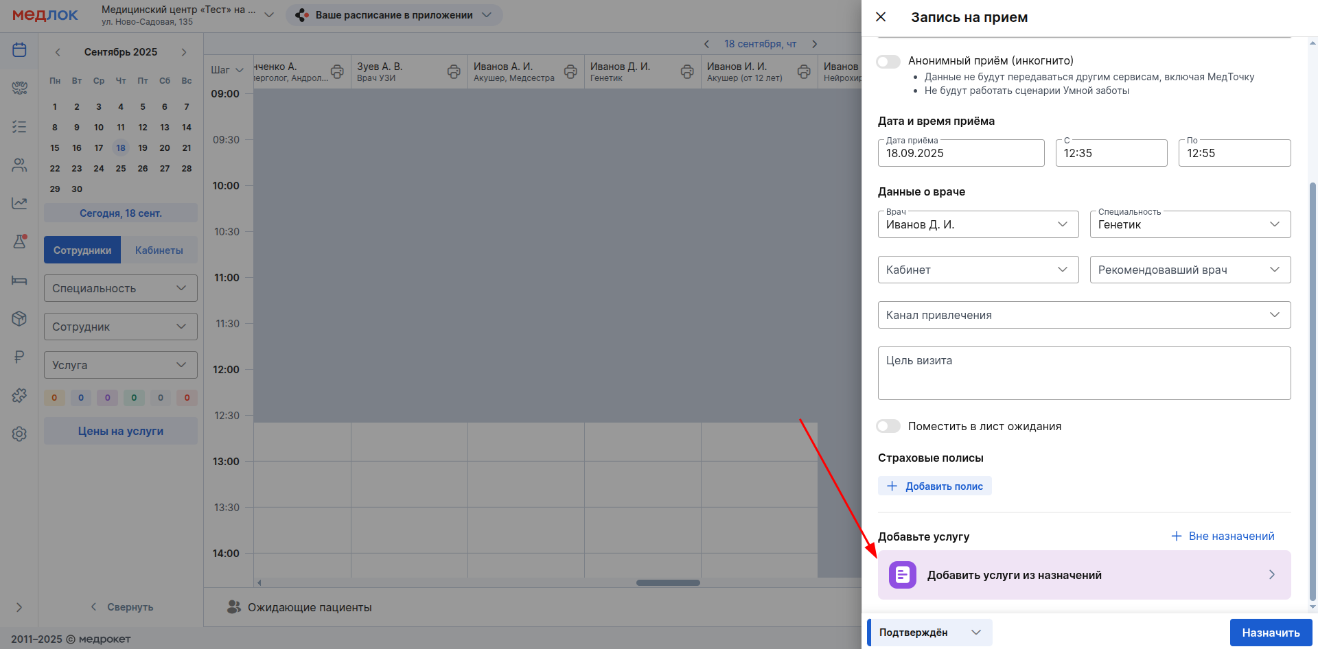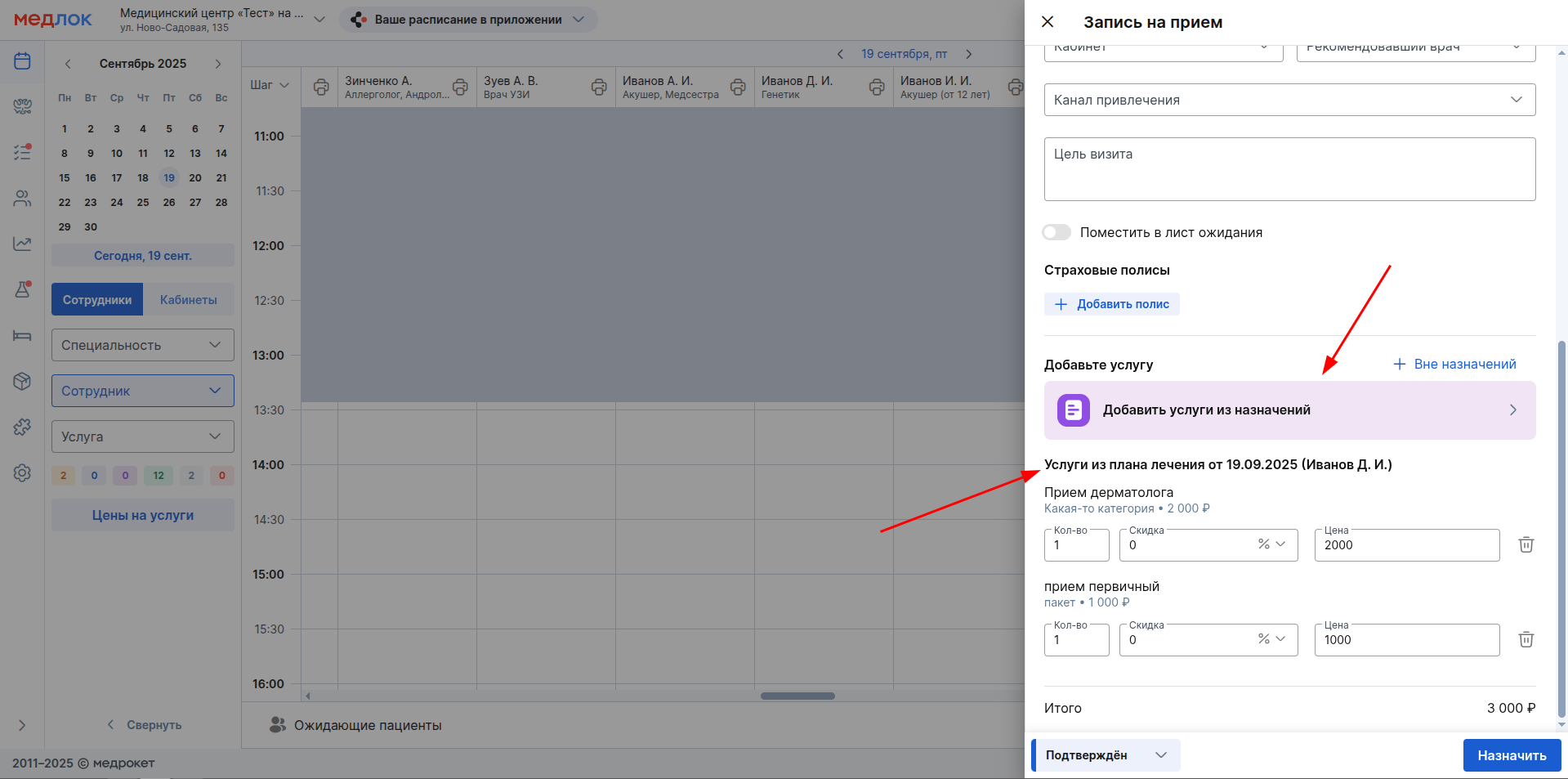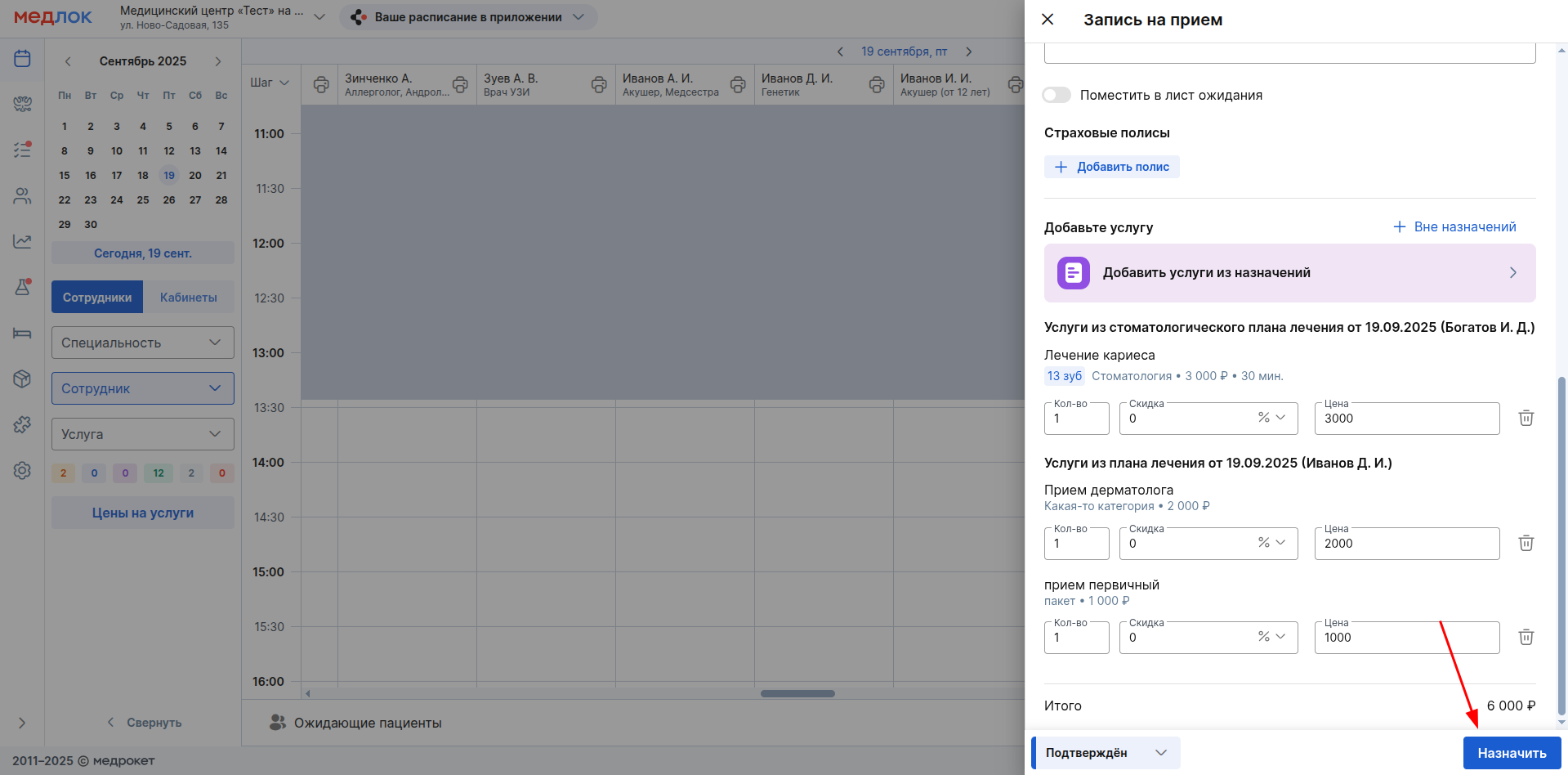 7. После добавления всех нужных услуг, нажмите «Назначить» внизу окна создания приёма.