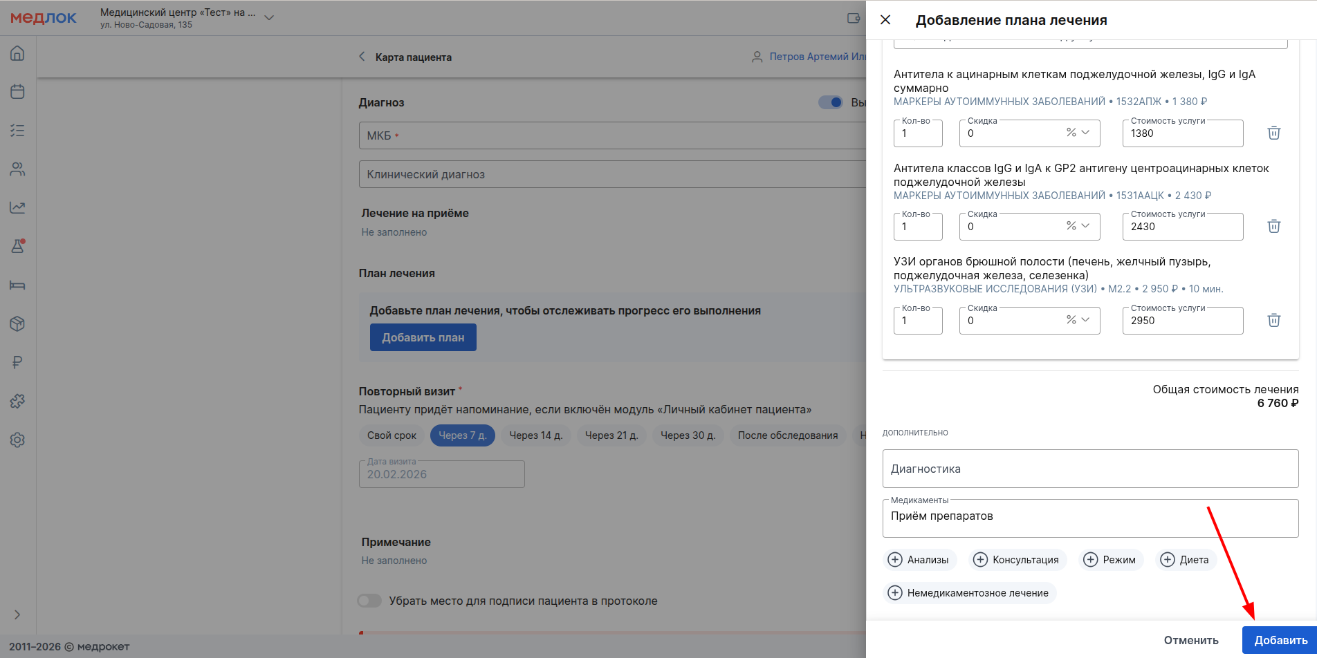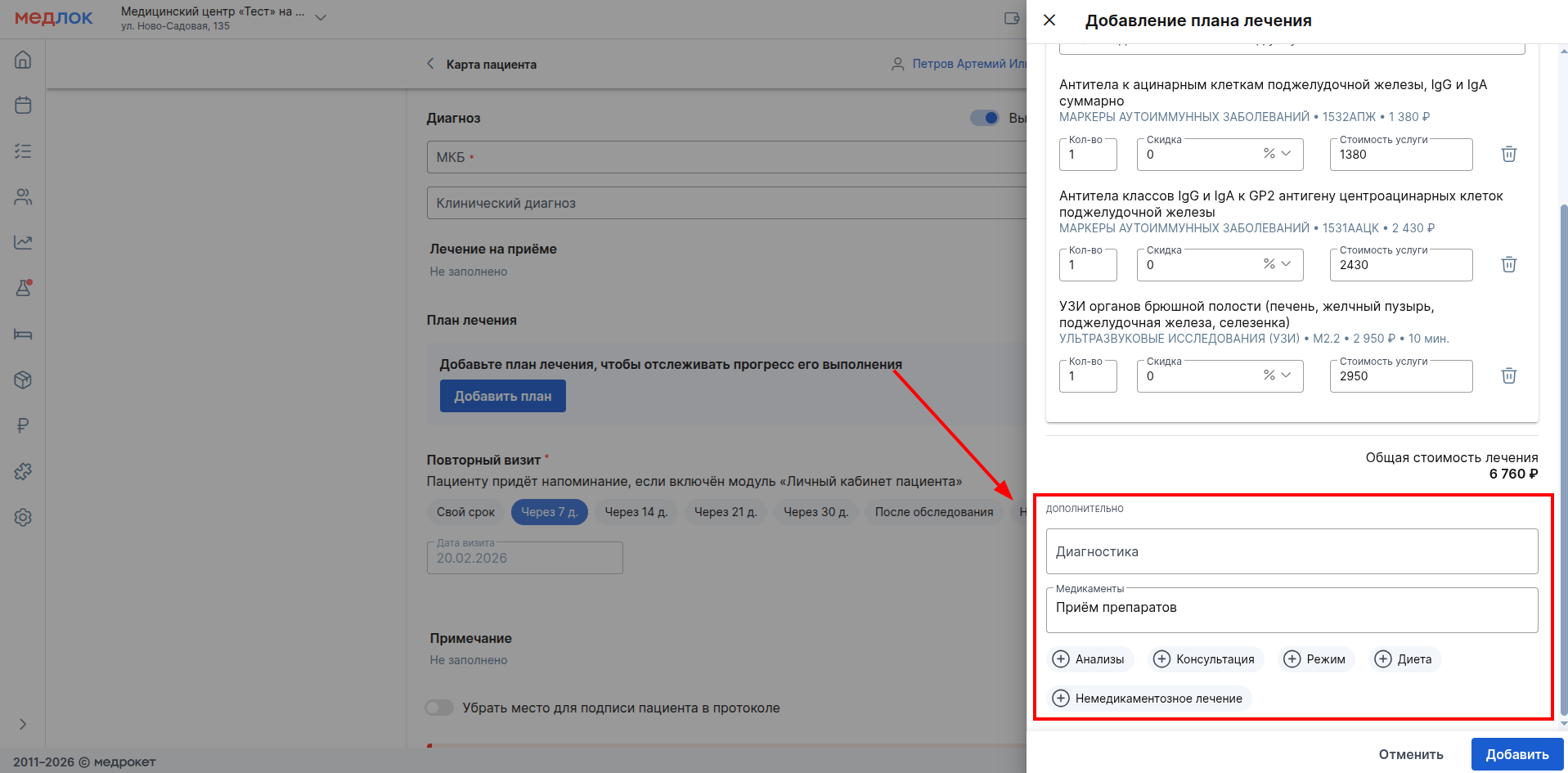 3. Вы также можете дополнить план лечения услугами, которых нет в каталоге вашей клиники, рекомендовать режим, диету и т. д.