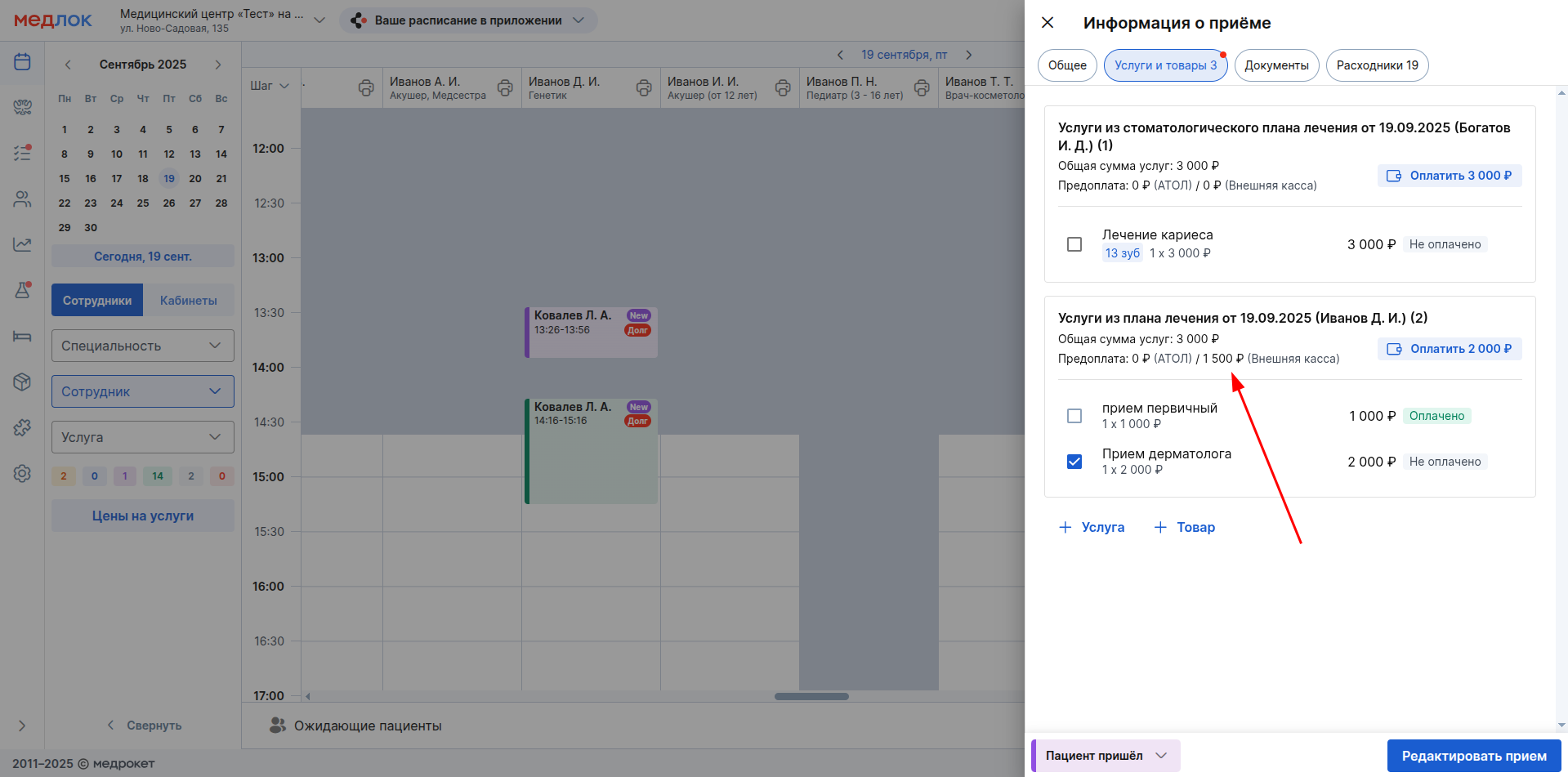 Если пациент вносил предоплату или у него есть долг, эти сведения также будут отображены в плане.