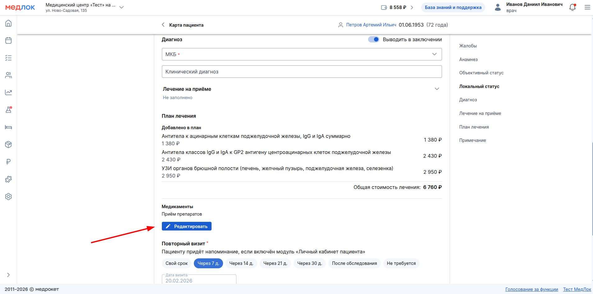 Чтобы изменить план лечения, нажмите «Редактировать» в протоколе приёма.
