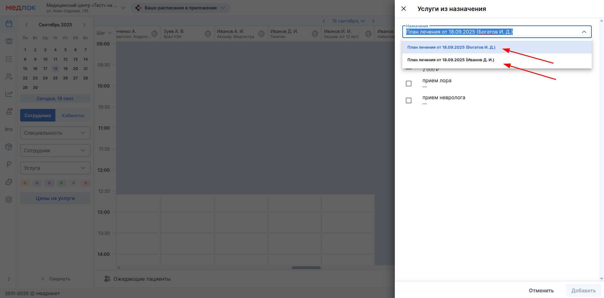 - Добавление в запись на приём услуг из плана лечения